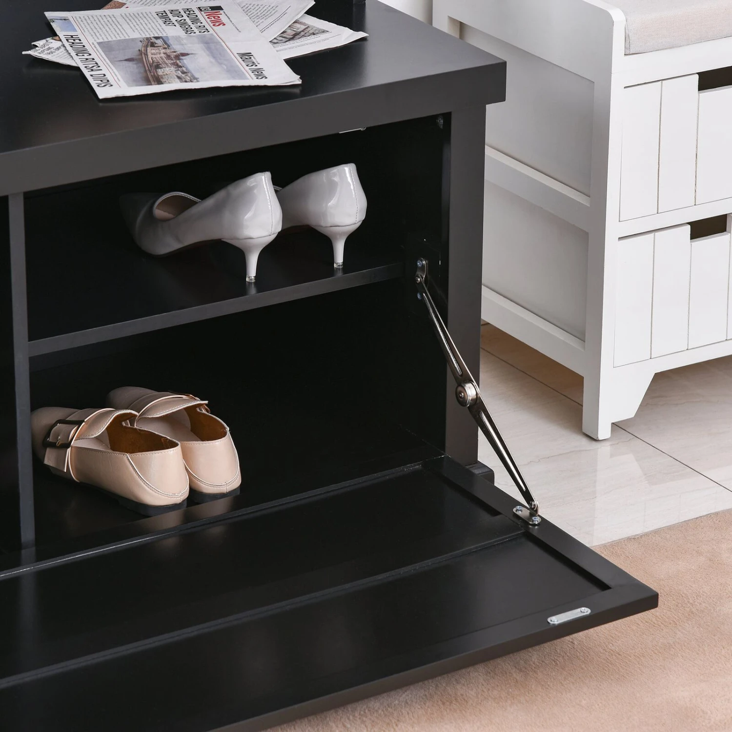 - – FITS IN ANY ROOM Open the bottom sliding door, there’s 4 small compartments, and can put shoes or other items. The cabinet is very suitable for the entrance of the hall or the bedroom.