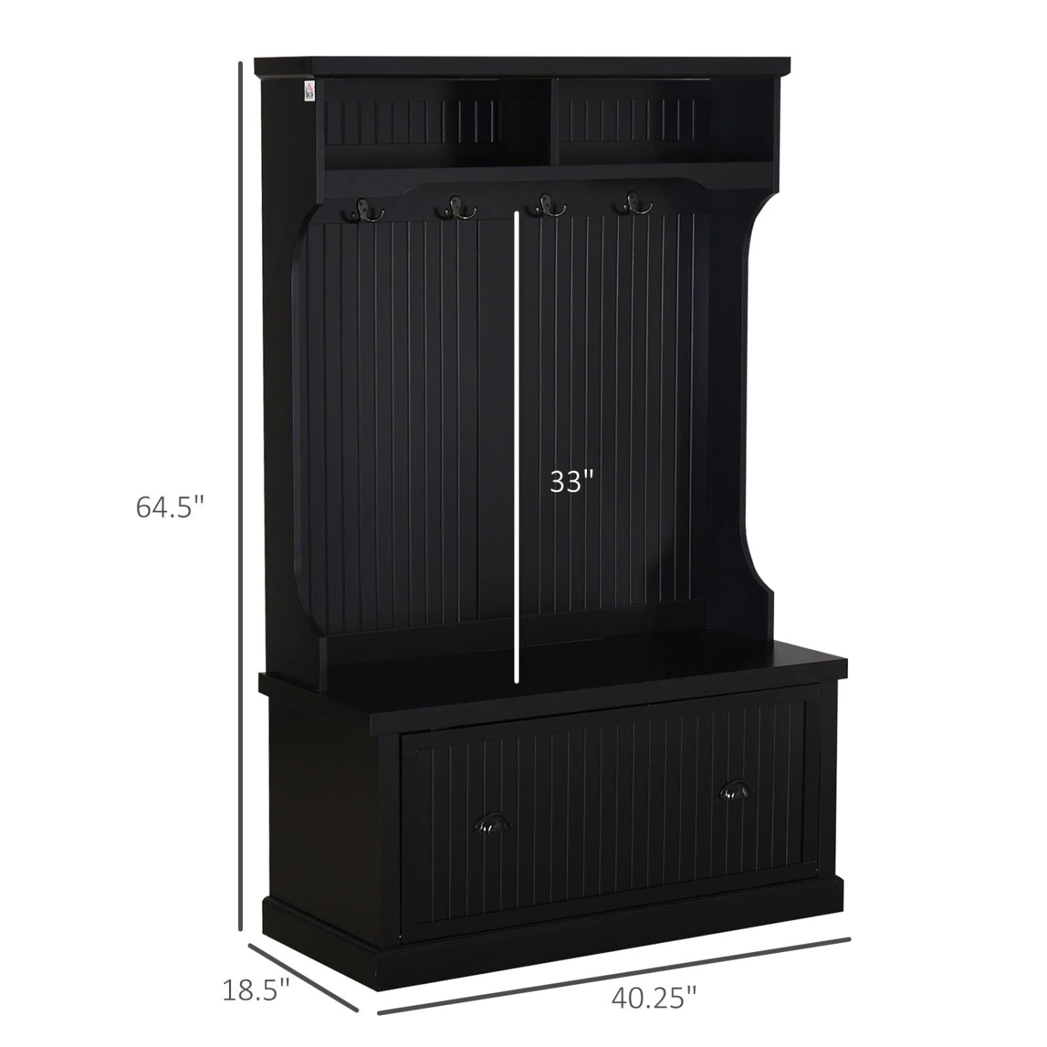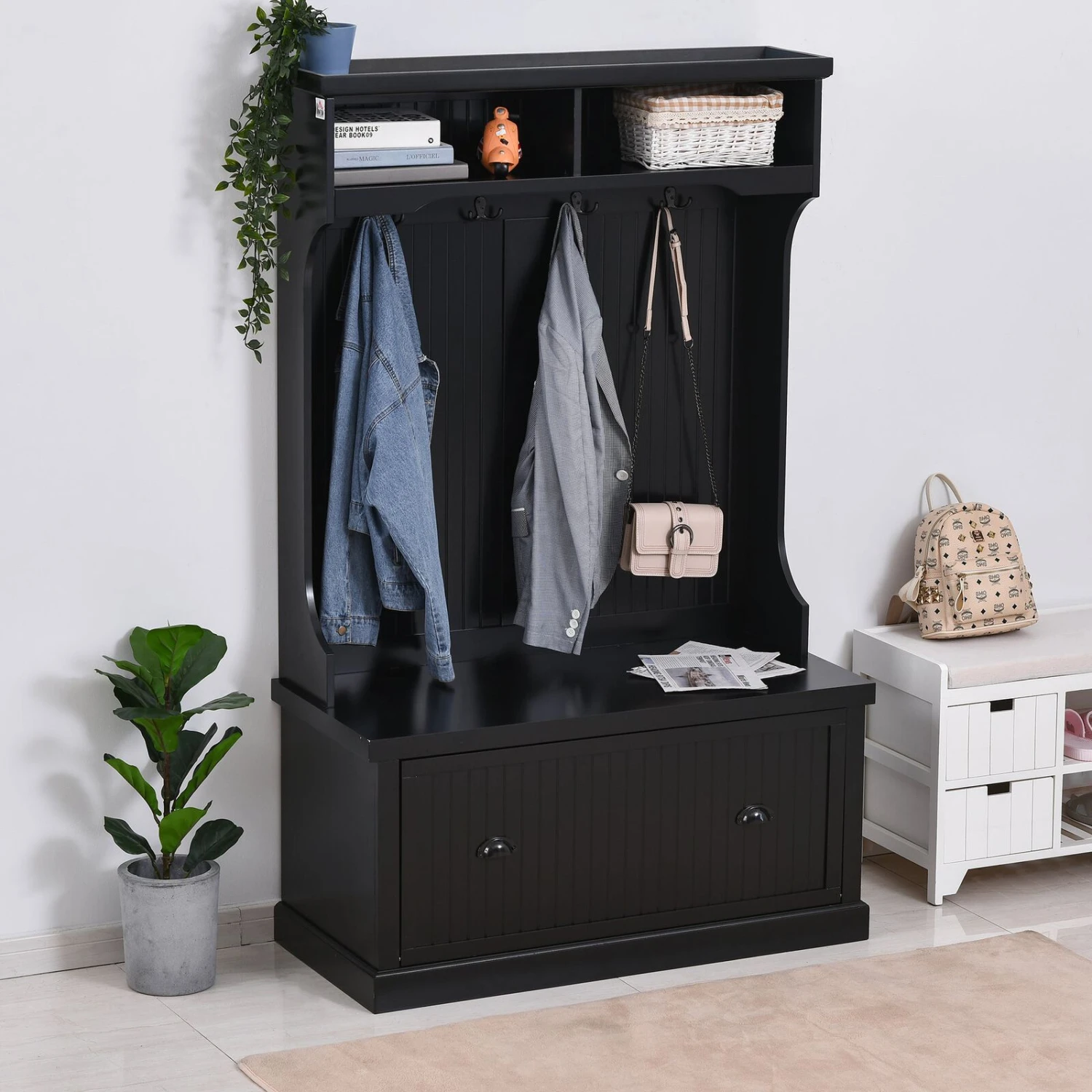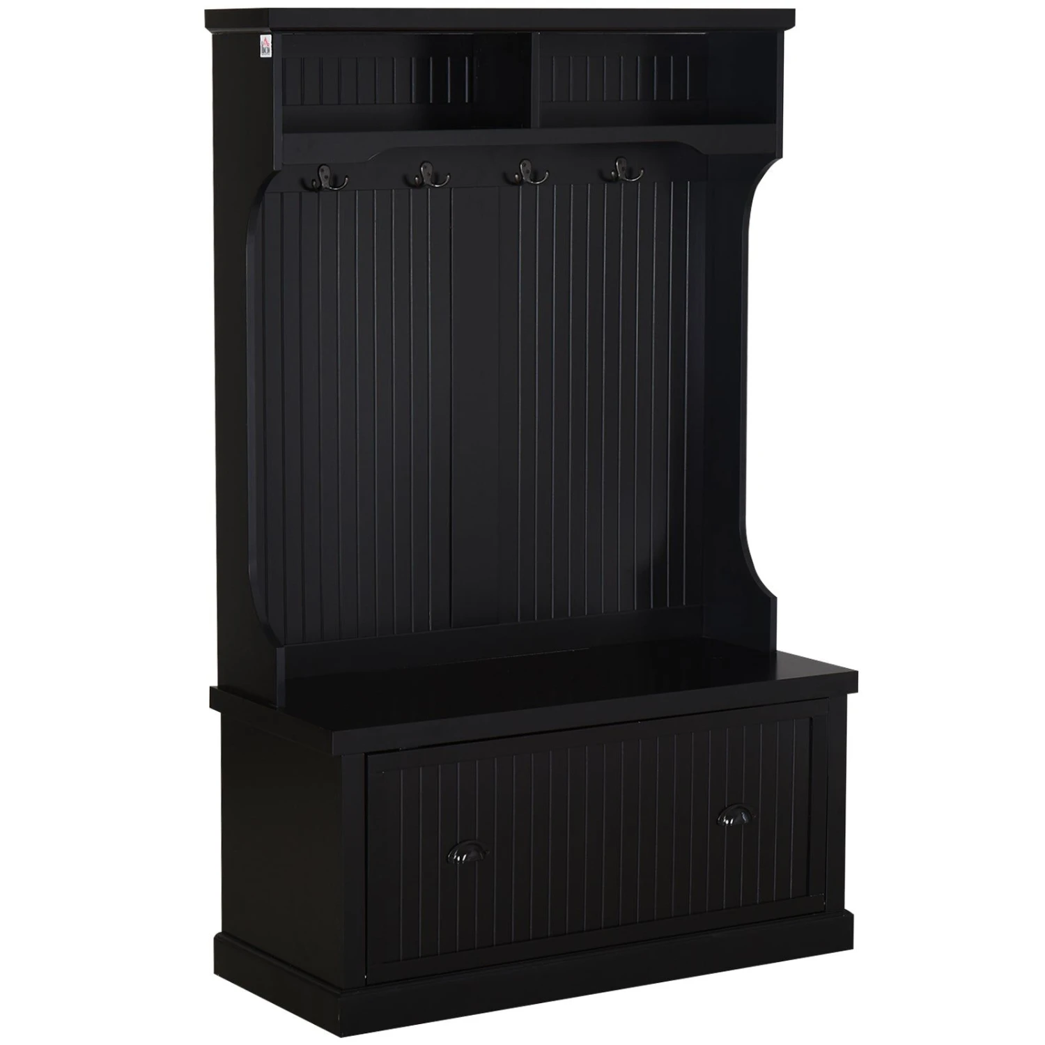 Hall Coat and Shoe Storage Hall Cabinet with Top and Bottom Storage Metal Double Hooks and Bench Black