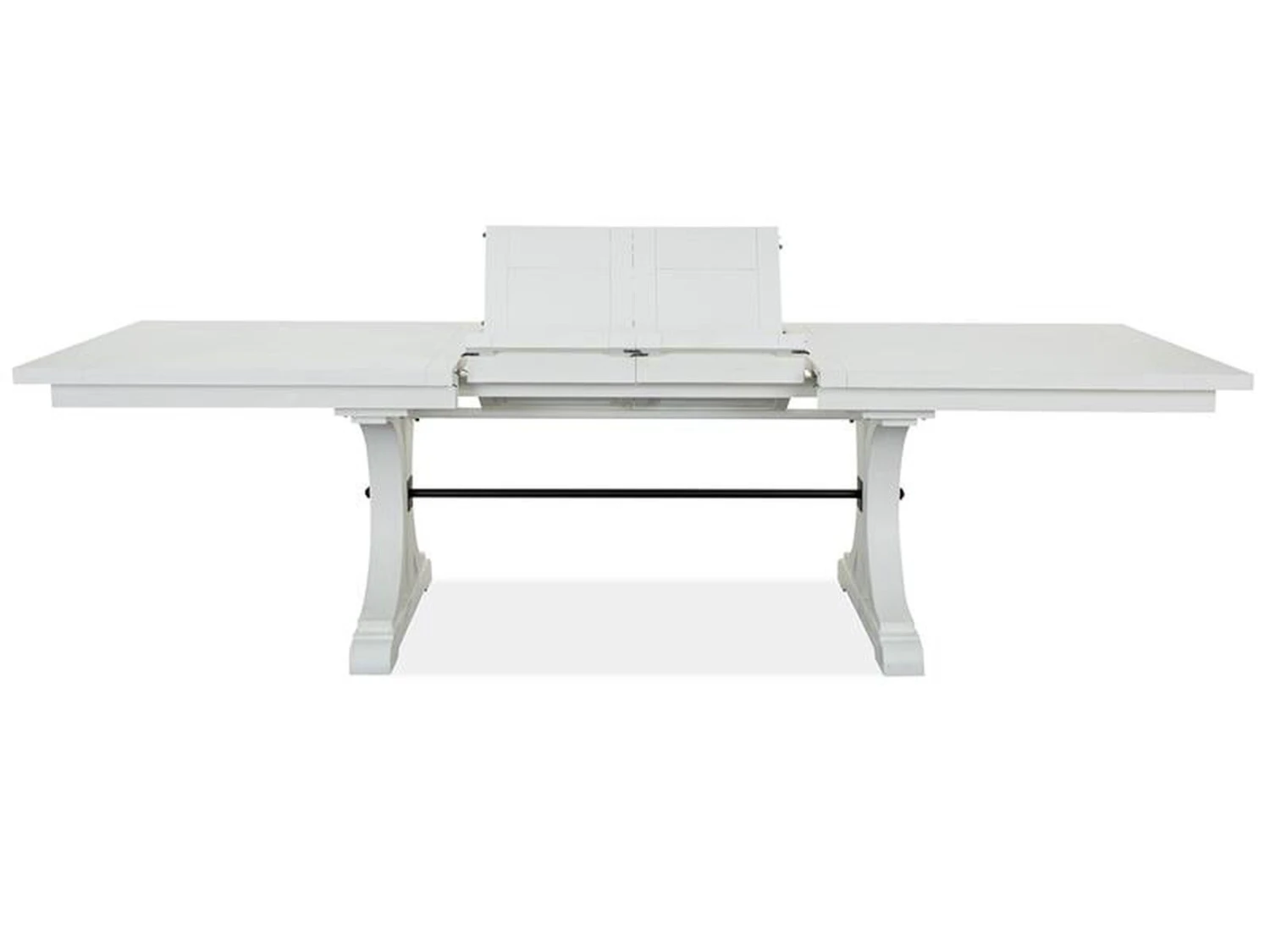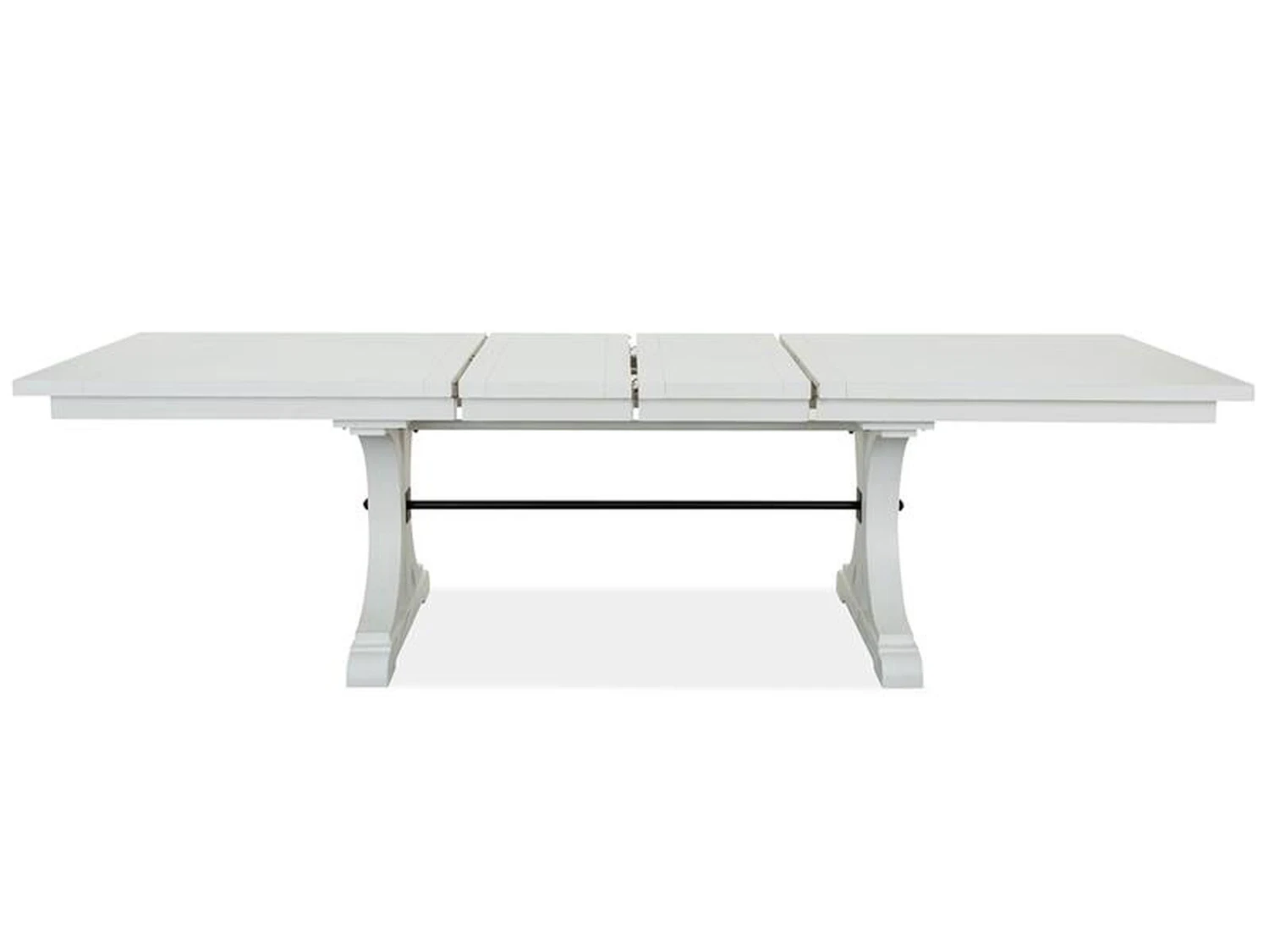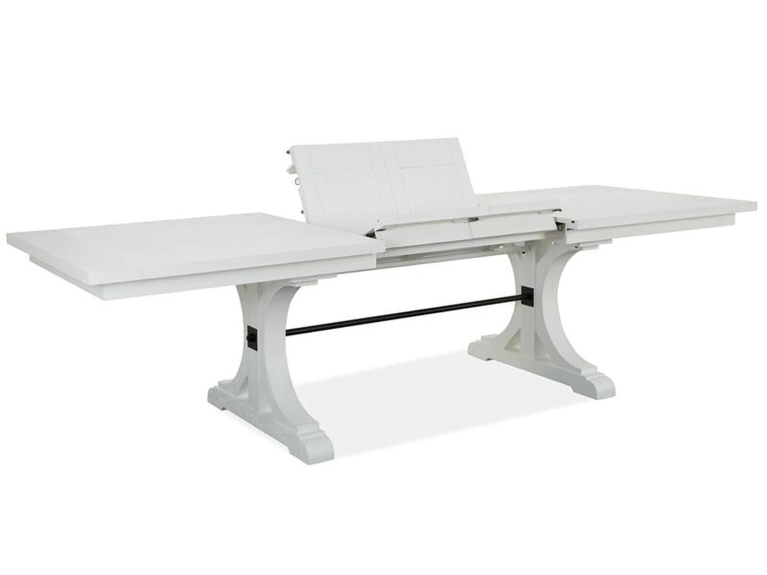 The Harper Springs Trestle Table is a captivating blend of rustic farmhouse elegance and contemporary industrial style. Crafted with a combination of pine veneer and MDF, this table is as versatile as it is charming. With the inclusion of two butterfly extension leaves, each measuring 16 inches, the table can be expanded to a generous 112″x40″x30″ size. The sturdy metal guides and central stretcher provide stability and support, while levelers ensure a balanced and level surface. With a weight capacity of 200 lbs for the top, this table is both robust and beautiful, making it a delightful addition to any space. The Harper Springs Collection is inspired by architectural elements from 19th and 20th-century farmhouses, featuring window-pane motifs, black metal details, and a craftsman-like silhouette that exudes an authentic and casual ambiance. Whether you envision loft living or a country home, the Harper Springs Collection breathes life into your dream home.