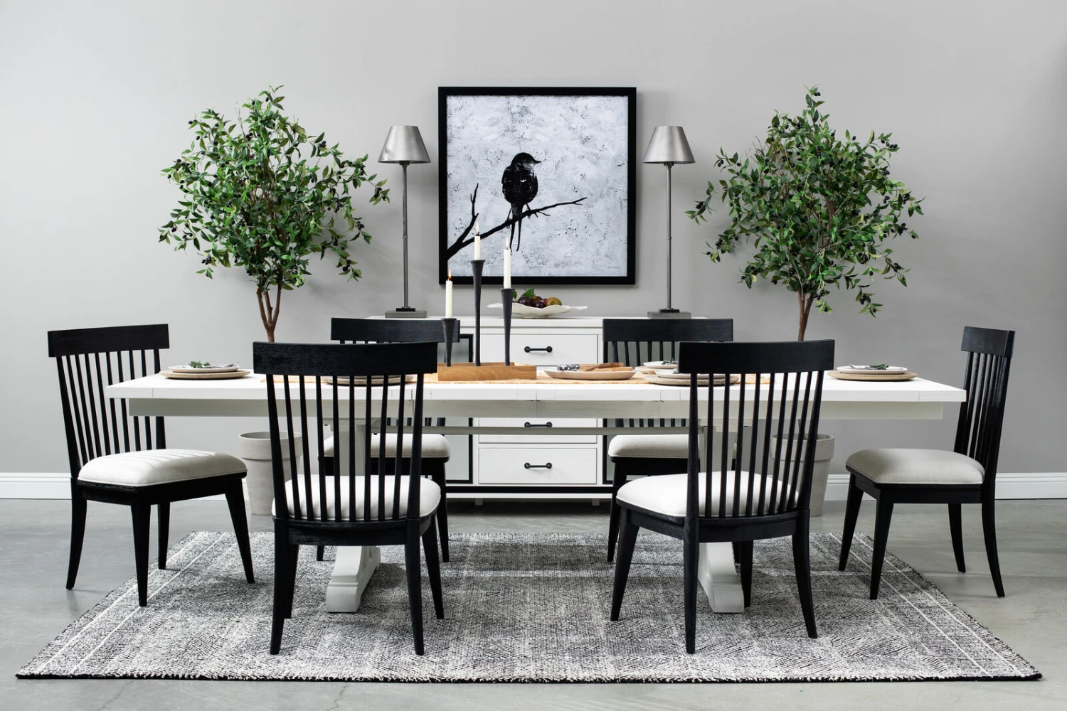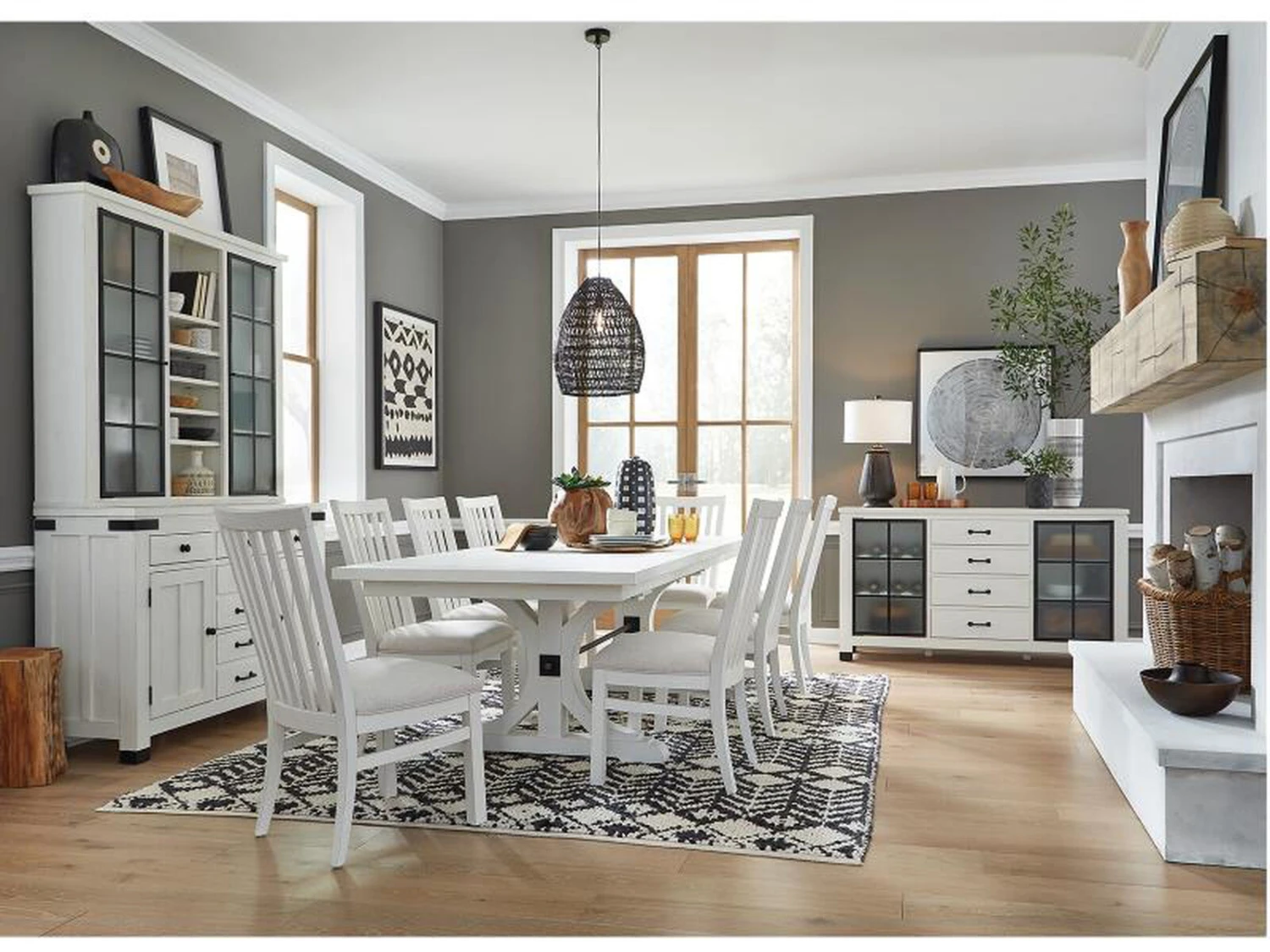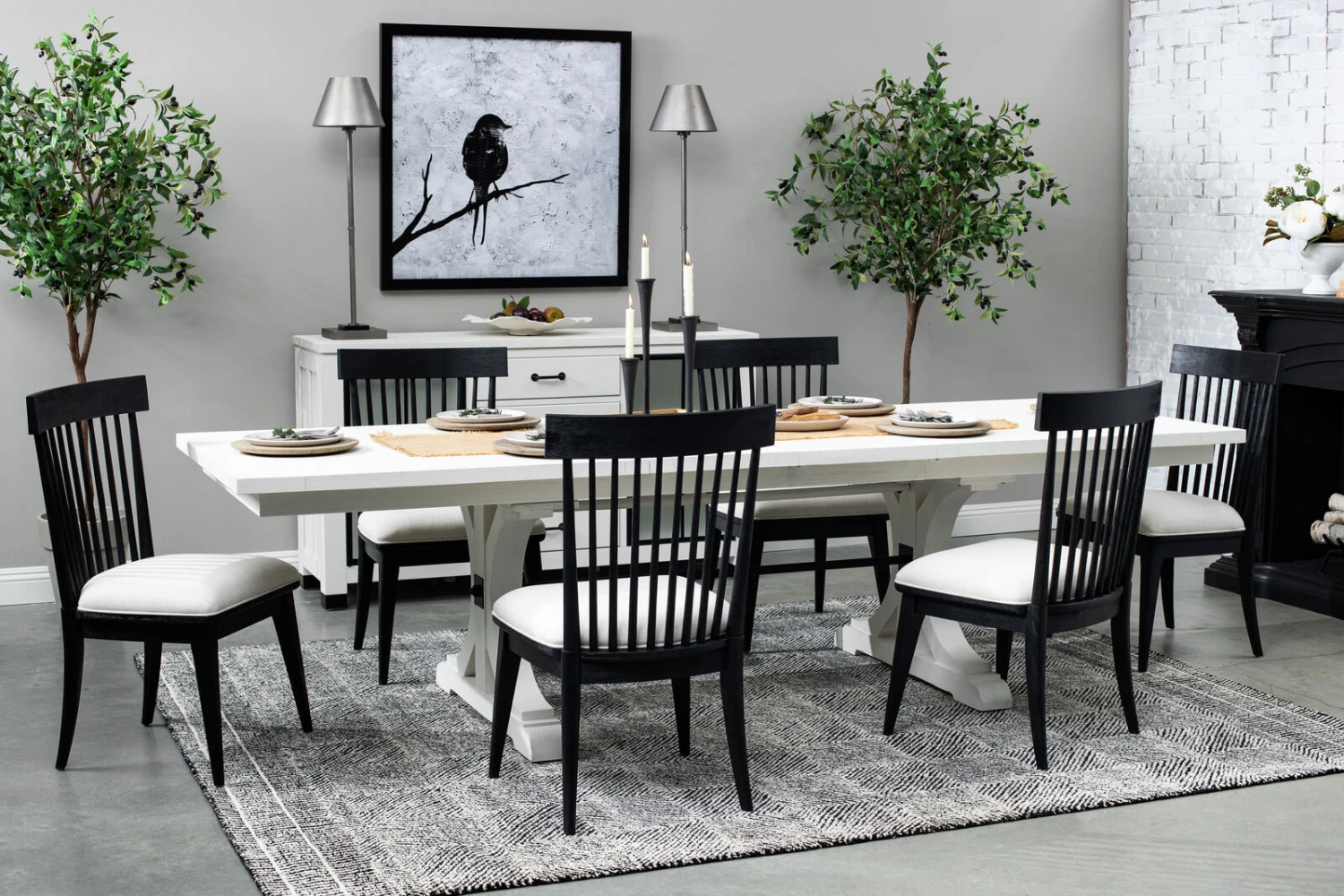 The Harper Springs Trestle Table is a captivating blend of rustic farmhouse elegance and contemporary industrial style. Crafted with a combination of pine veneer and MDF, this table is as versatile as it is charming. With the inclusion of two butterfly extension leaves, each measuring 16 inches, the table can be expanded to a generous 112″x40″x30″ size. The sturdy metal guides and central stretcher provide stability and support, while levelers ensure a balanced and level surface. With a weight capacity of 200 lbs for the top, this table is both robust and beautiful, making it a delightful addition to any space. The Harper Springs Collection is inspired by architectural elements from 19th and 20th-century farmhouses, featuring window-pane motifs, black metal details, and a craftsman-like silhouette that exudes an authentic and casual ambiance. Whether you envision loft living or a country home, the Harper Springs Collection breathes life into your dream home.