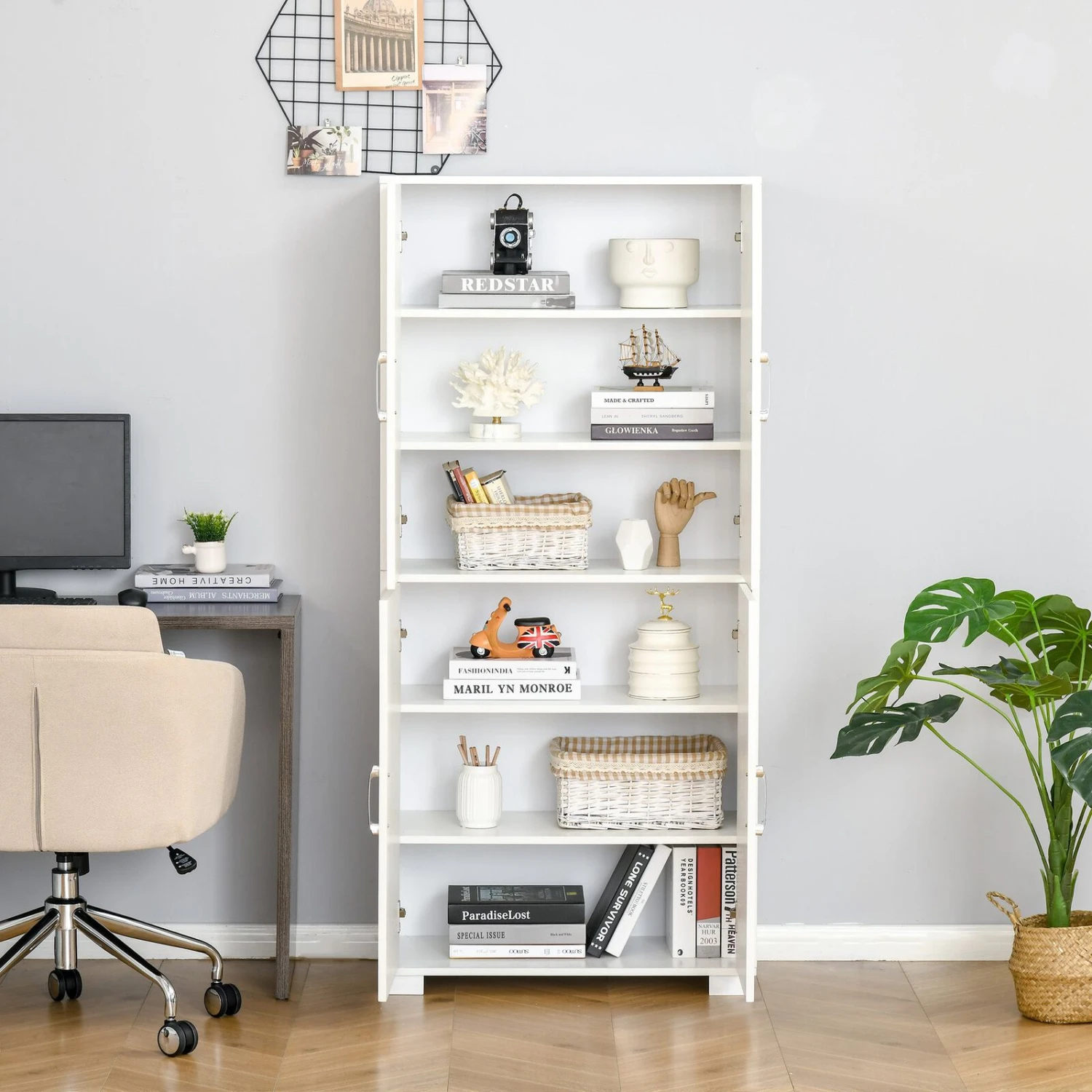 - – 4-Door Storage Cabinet This pantry organizer offers ample space for storing daily essentials. 2 stationary middle shelves are in each cabinet for storing tools and supplies, as well as towels and books.