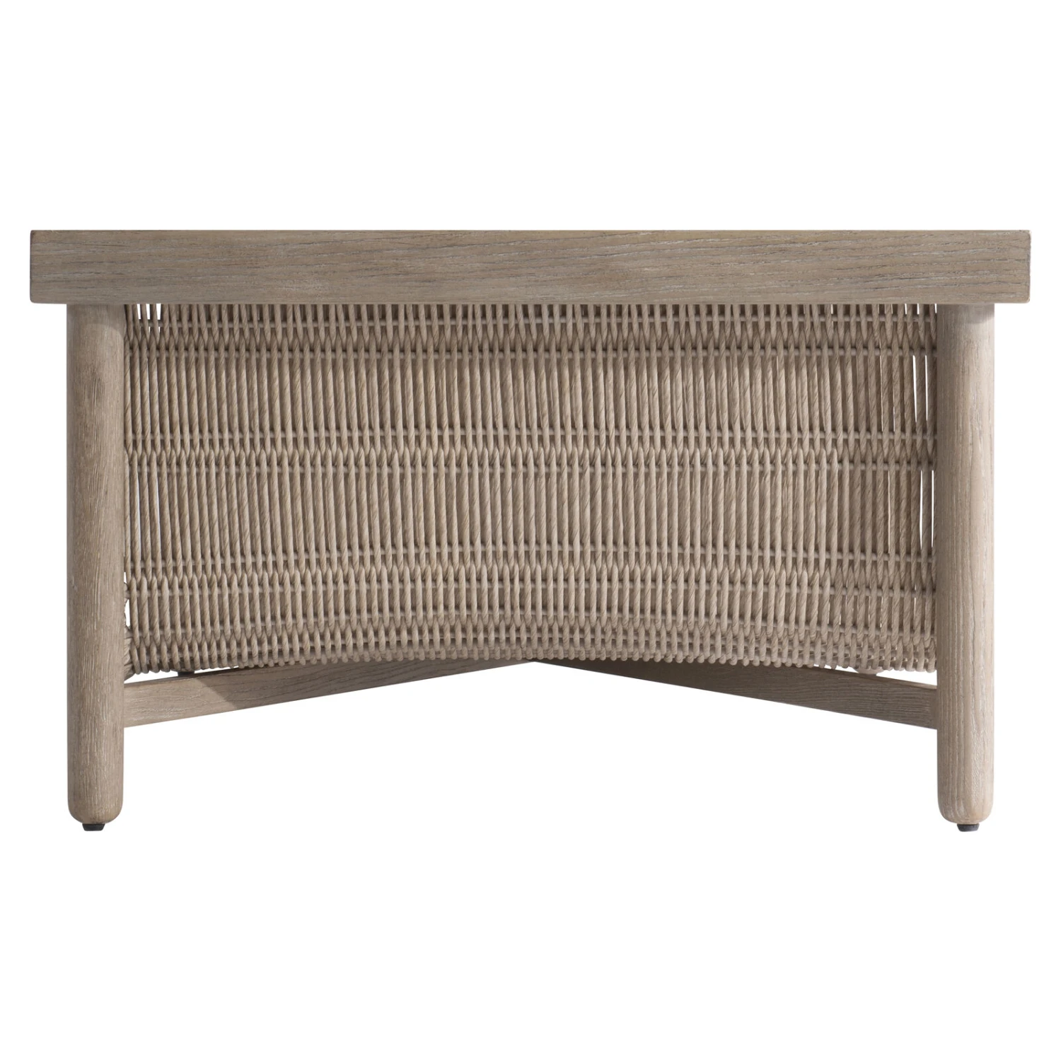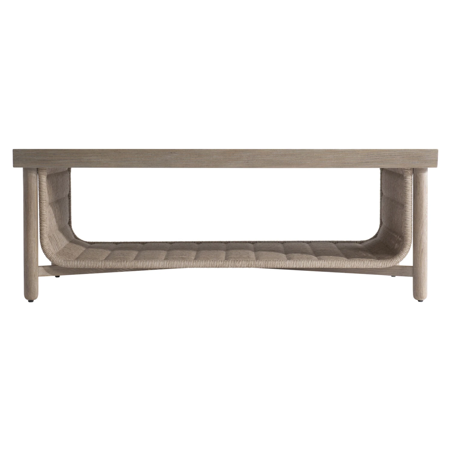Twisted and woven rope is fashioned into a U-shaped shelf on the unique Santiago cocktail table. Quartered white oak solids and white oak veneers in a Sandbar finish create the top and legs. The gorgeous design is a modern organic look with a singular style.