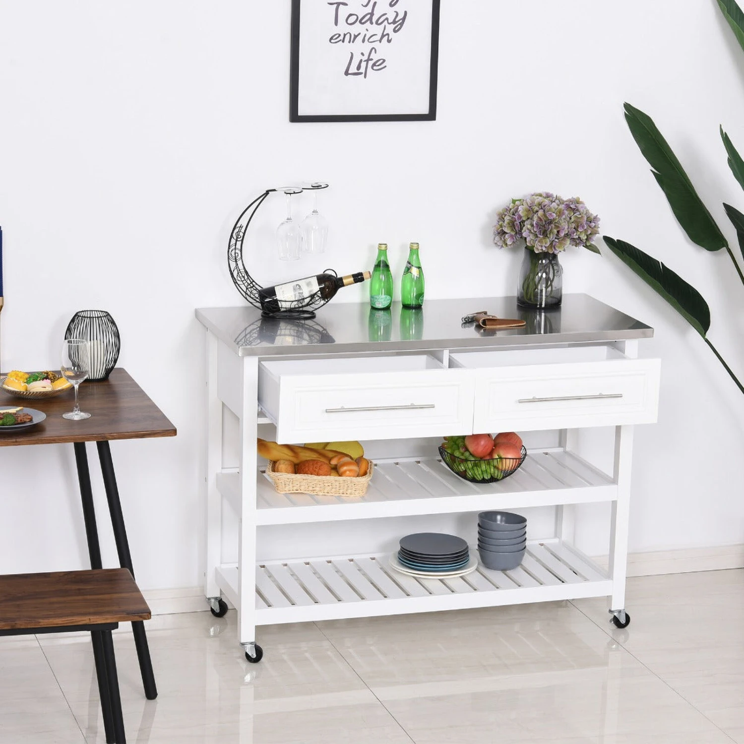 - – ADD STYLE TO YOUR HOME This 2-tier rolling kitchen island is built in a rustic farmhouse style with beautiful white pine and engineered wood, a stylish stainless steel top, 4 smooth casters, and ample storage and shelving.