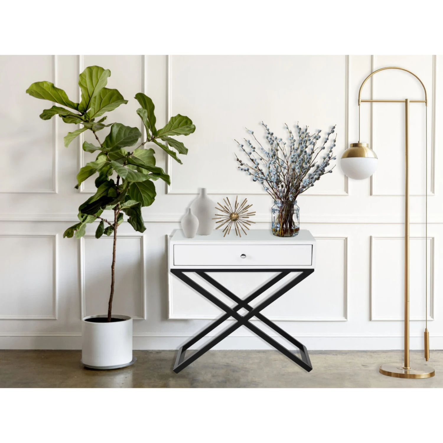 Koda White Wooden End Side Table Nightstand with Glass Top, Drawer and Metal Cross Base