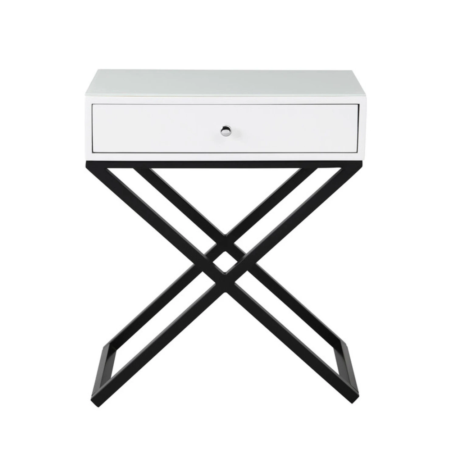 Organize and declutter with the Koda side table. Place this table as a nightstand to your bed or as an end table in your living room. The one drawer with silver knob provides storage space for your everyday necessities. The finely crafted tabletop works perfectly for your lamp, picture frames, and any other decorative items for display. The MDF tabletop has a tempered glass for a contrasting material. The base is not only designed with an attractive black cross leg, but also solidly built with sturdy metal legs. Available in other colors that will complement your home’s specific decor.