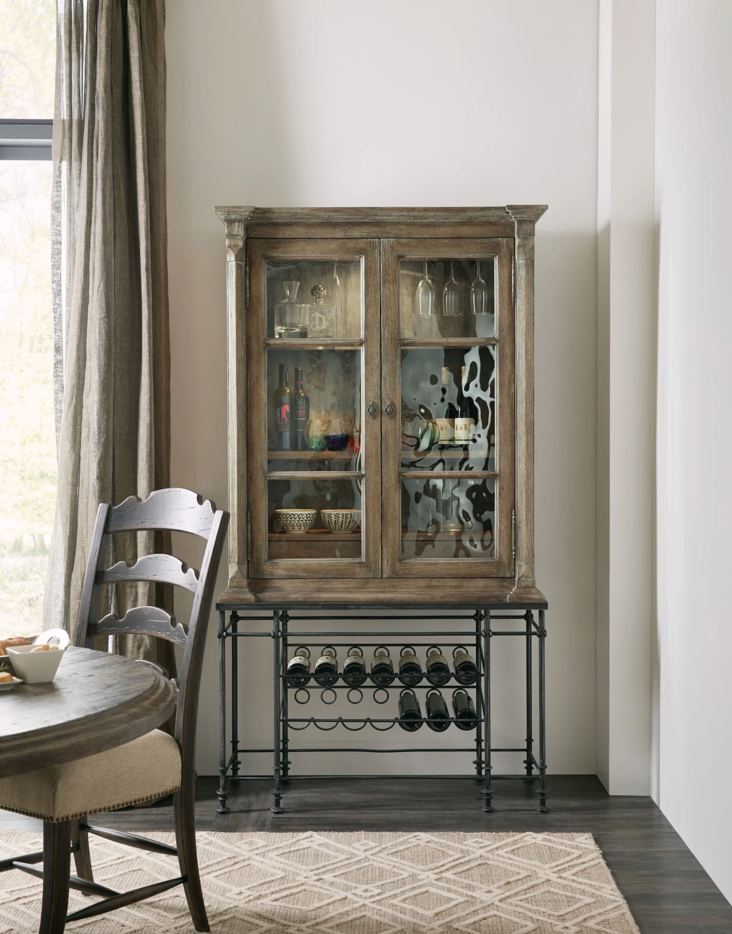 Inspired by the Hill Country region of Texas, the O’Quinn Bar Cabinet has the charm of a treasured antique from an inn or tavern in a small town on the prairie. The design is in the delightful details like seeded glass doors with 90-degree hinges, an inside back panel finished in the soft Blue Bonnet accent color with a rubbed patina and wine bottle storage in the metal base. Behind each of the doors are two adjustable wood-framed glass shelves, a puck light with touch switch controlled by a hinge in the top right, and wine glass storage in the top. Crafted of Hardwood Solids with Oak Veneer, the O’Quinn is finished in Washoff, a dry medium wood tone with the character of antiques.
