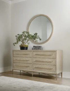 Plush, grand and inviting, the Leesburg Queen Upholstered Bed features an exquisite cream-colored, diamond-tufted headboard with a rich mahogany border on the headboard and footboard, along with nailhead trim in an antique brass finish. Crafted of elegant cathedral and swirl mahogany veneers. The bed includes headboard, footboard and rails, and the headboard can be used alone.