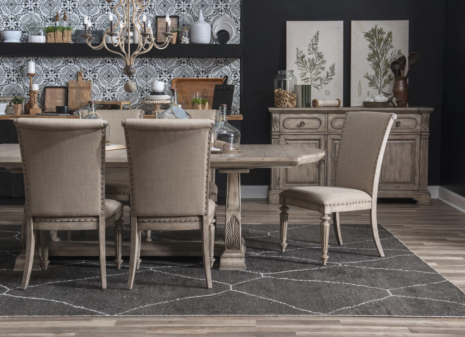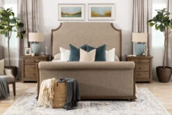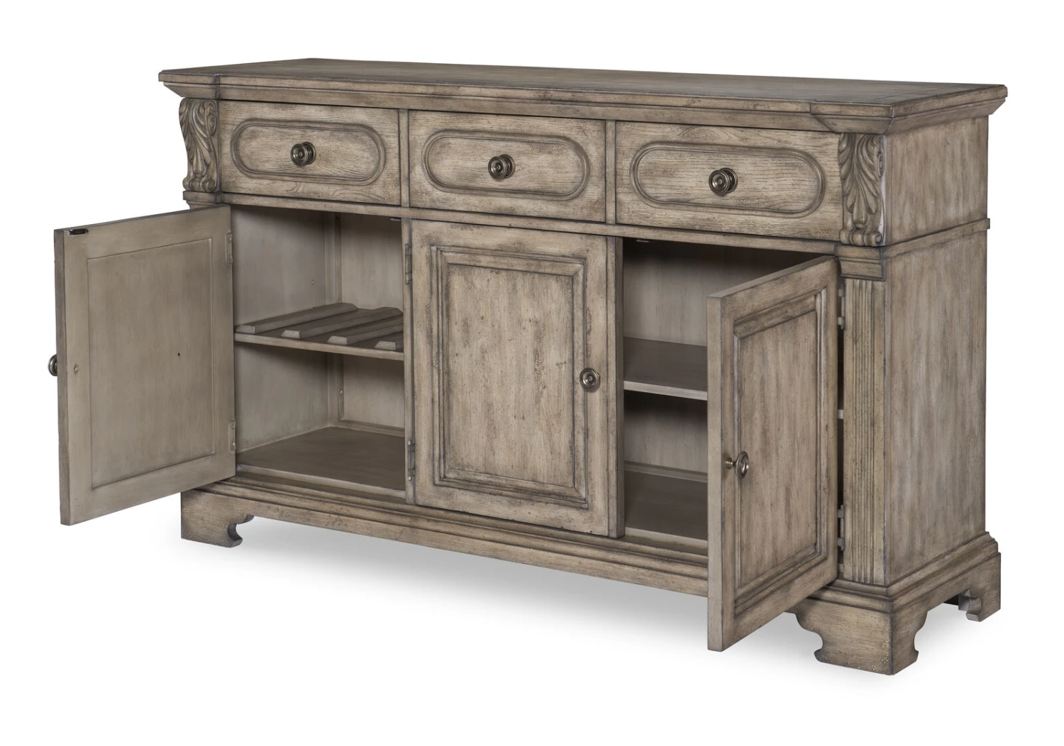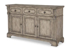 Design details such as fluted pilasters, framed drawer fronts, acanthus and fleur-de-lis carvings give each piece an authentic and timeless appeal. The scale of Sorona creates a bold statement, while the heavily distressed and aged Biscotti finish on Oak veneers creates an inviting palette. Inset stone tops on select items and Aged Pewter finished hardware add the final touches to this bedroom and dining collection.