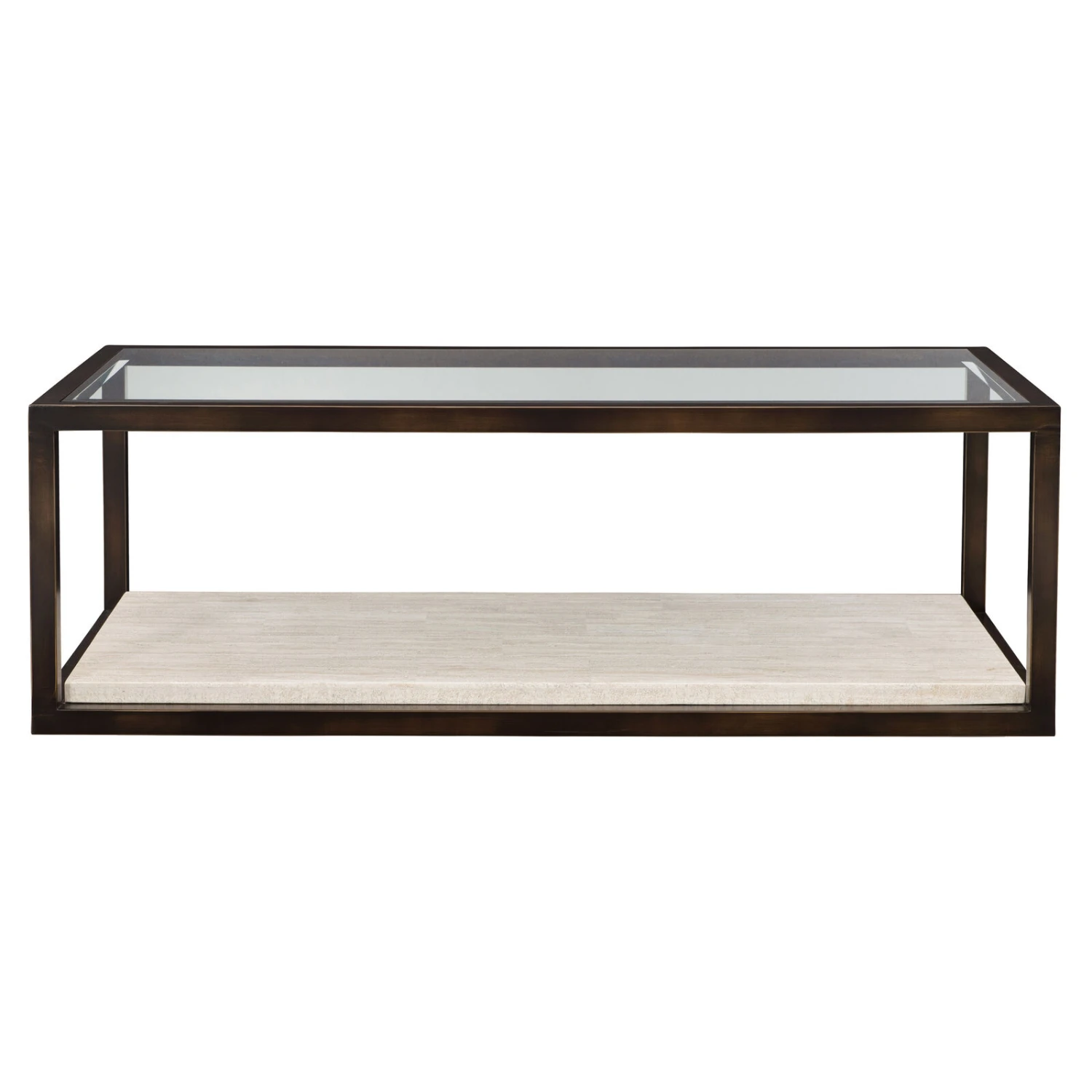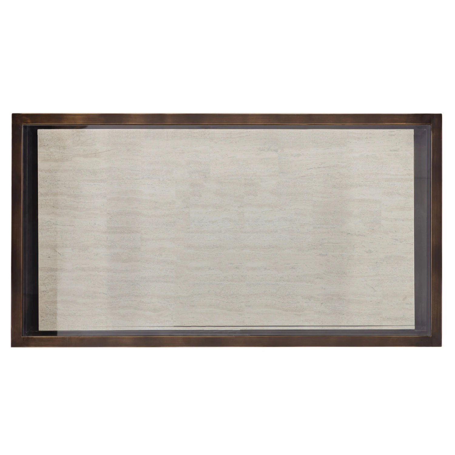 Bernhardt Occasional offers a wide range of upscale designs for luxe living spaces. The Kinsley cocktail table makes a bold statement with a streamlined rectangular frame constructed of bronze-finished tubular steel. The white travertine bottom shelf perfectly complements the bronze tempered glass top for a dimensional and balanced effect.