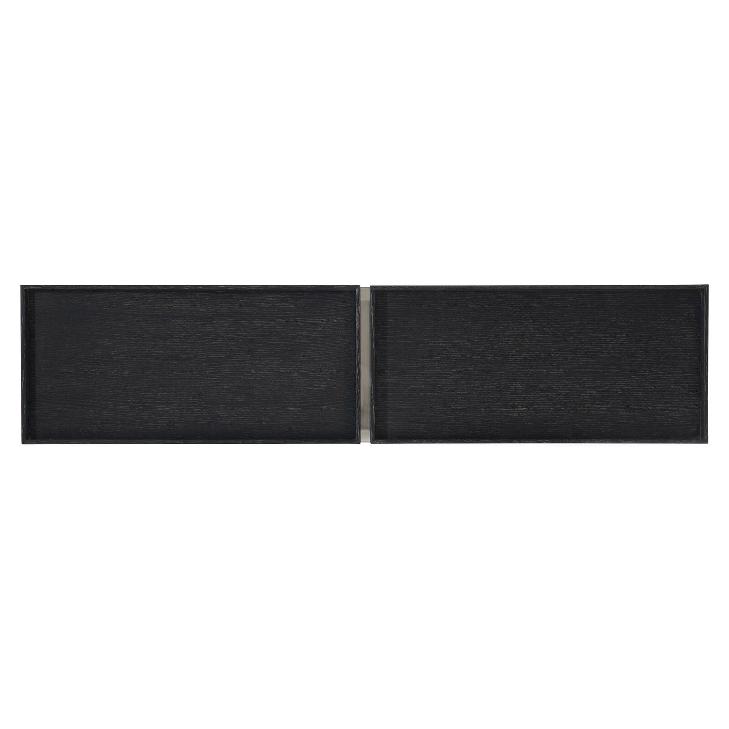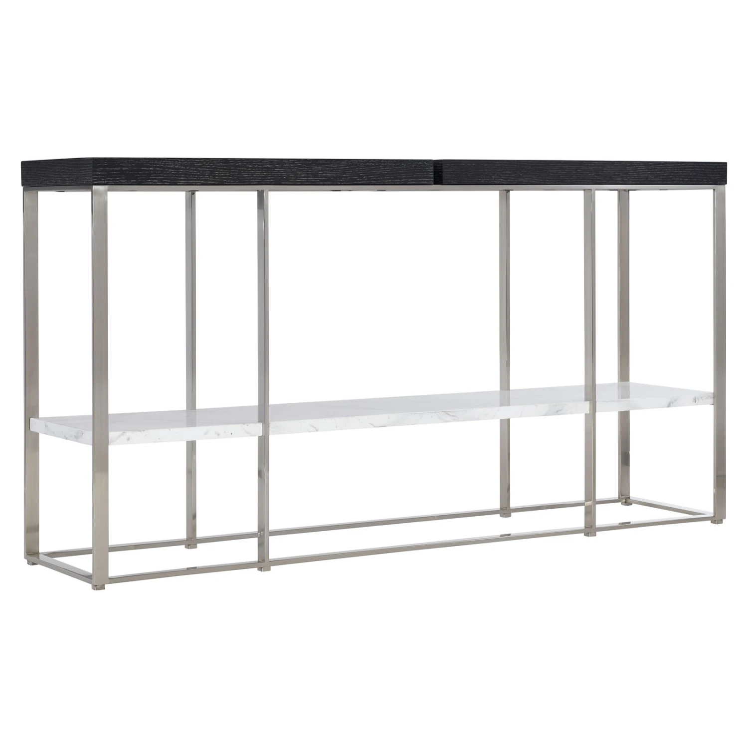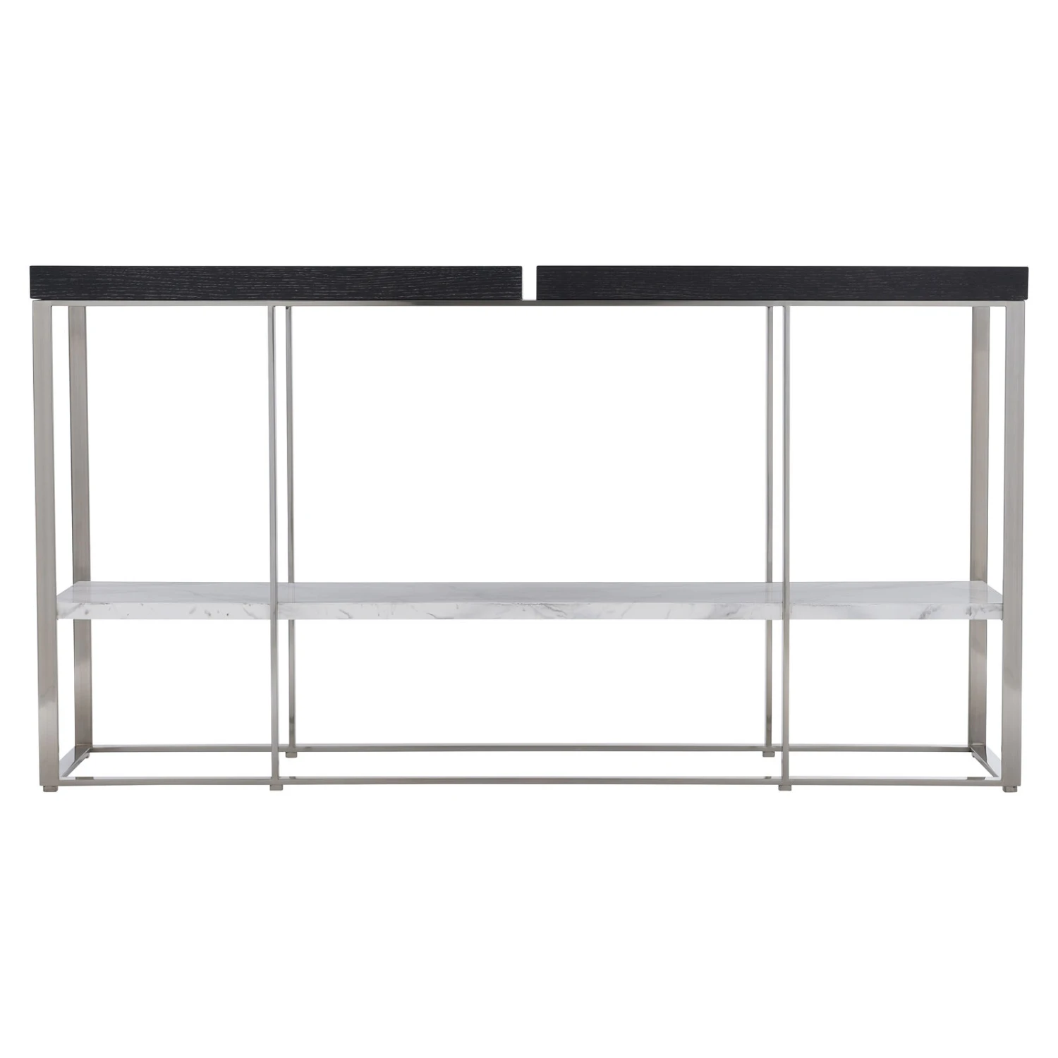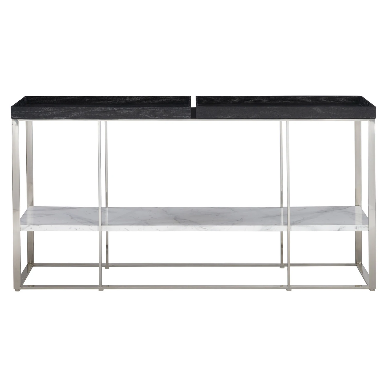 The Lafayette console table pairs touches of glamour with a modern sense of style. The clean, linear design features a top composed of two wood trays with a small gap in between. A hand-painted faux marble shelf contrasts with the dark cerused mink finish on quartered white oak veneers. The simple and sleek stainless steel frame adds pop.
