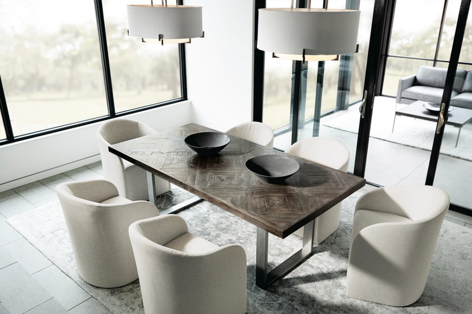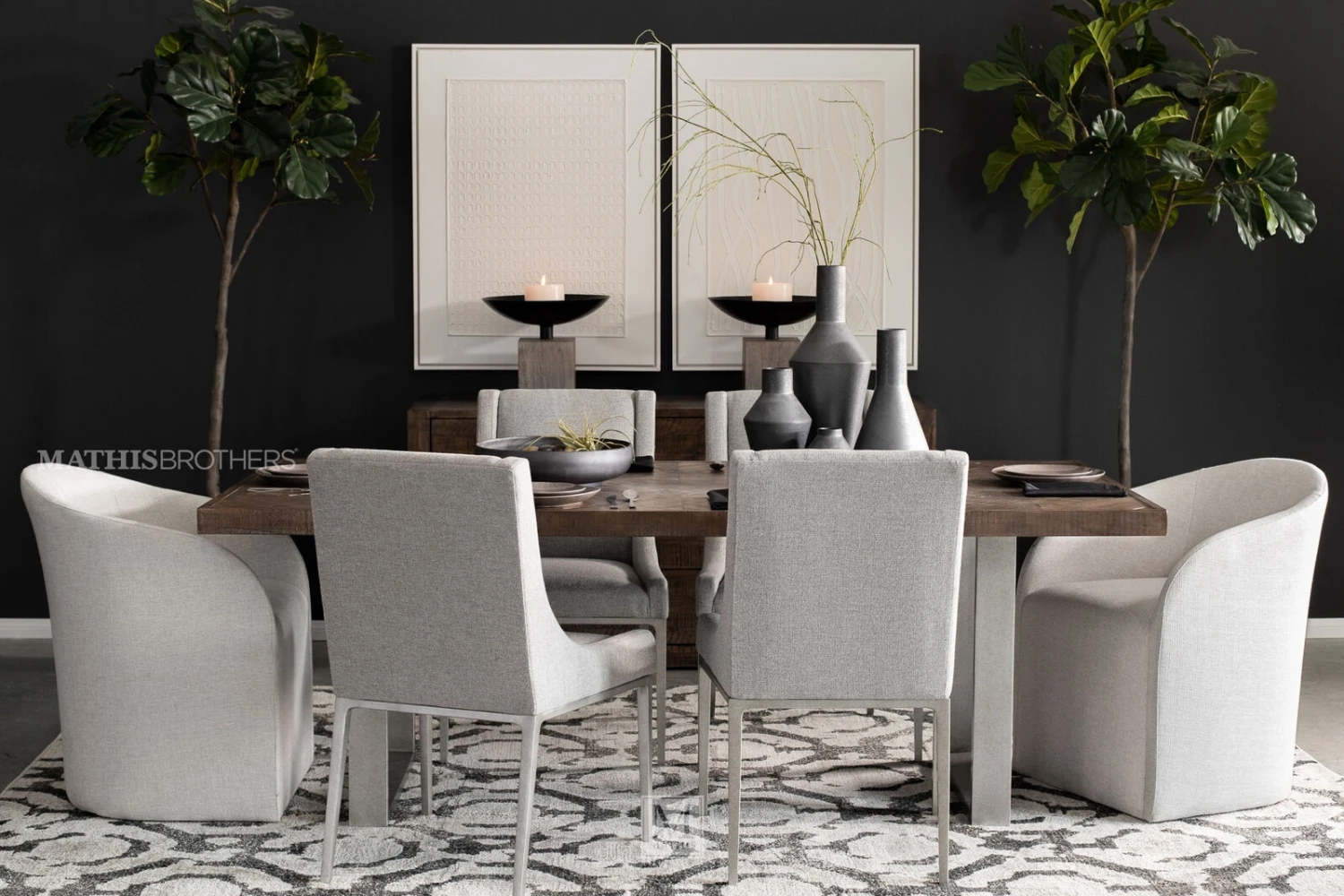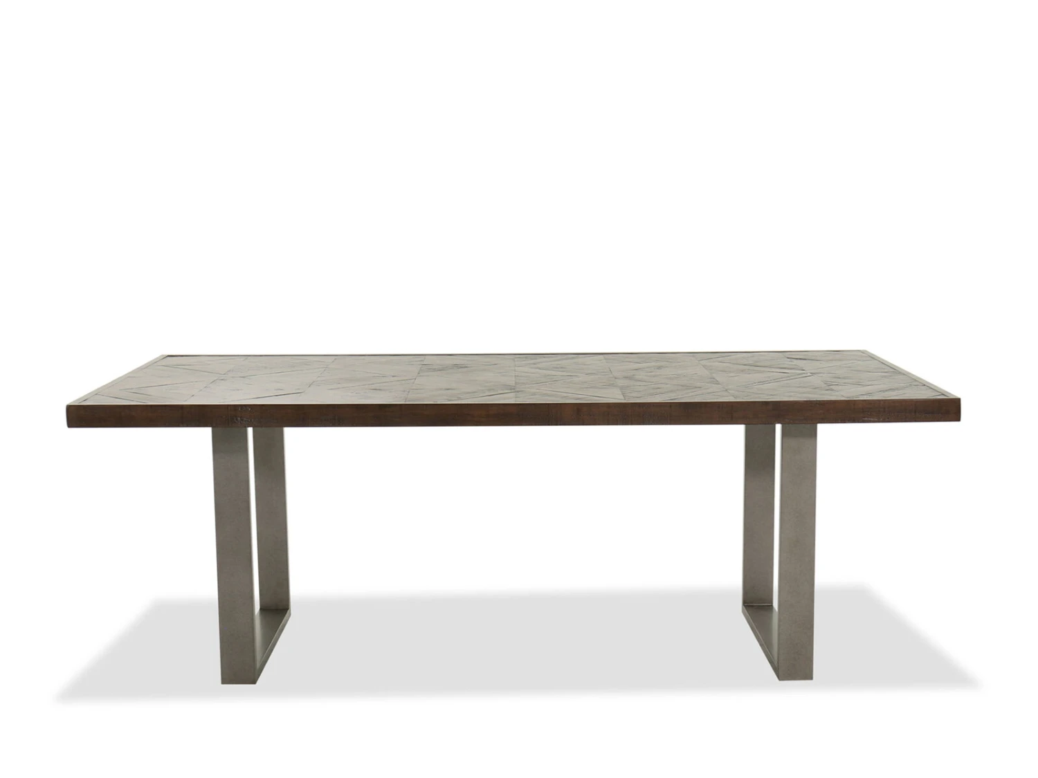 The Draper Rectangular Dining Table is a great addition to your dining area. It features a long and wide table top that can easily seat a dinner party of six. It stands on a couple of sturdy tubular pedestals forged from solid steel that provide ample support and stability. The blend of industrial perfection with rustic charm offers a refined look and maintains a casual tone in your dining room. The rectangular top is finished in a beautiful shade of brown and neatly detailed with a pattern of squares grids for visual interest held by grey metallic legs.