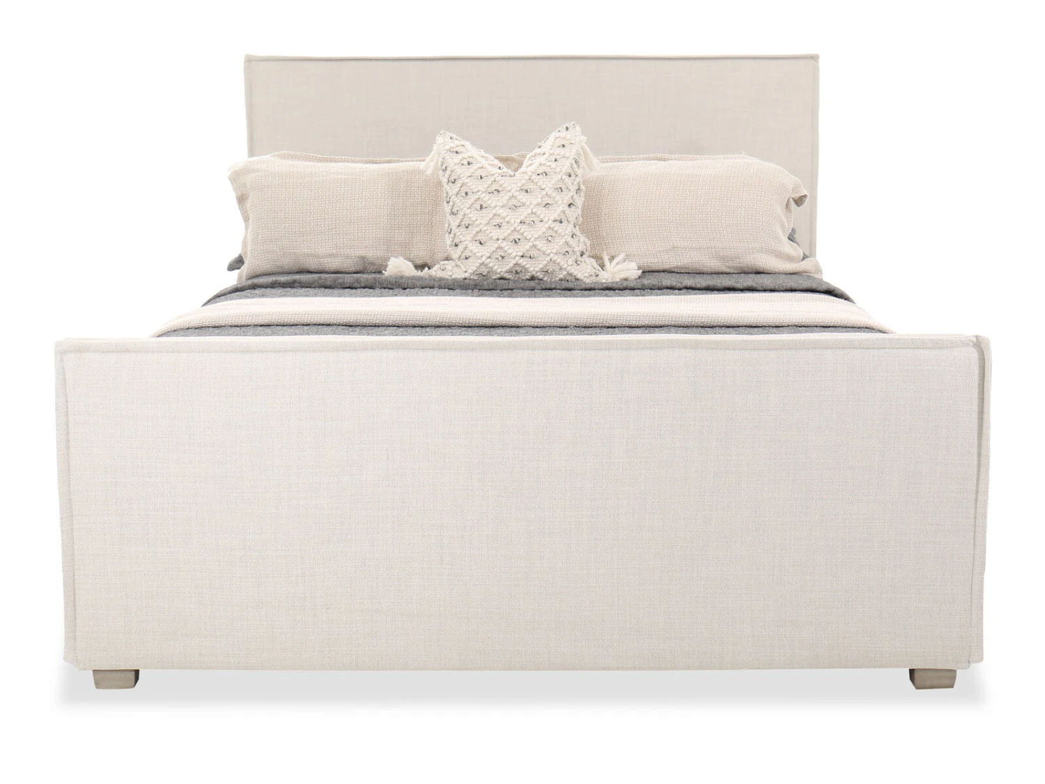 The Sawyer Upholstered Bed strikes a flawless unity between comfort and refinement. The beige upholstery on the sturdy headboard and footboard infuses a warm atmosphere that is conducive for sleeping. Standing on wood feet stained in brown, this bed features a five-slat system for sturdy support that prevents undulations and bumps on the mattress. Made from quality materials, this bed is sure to last for a lifetime.