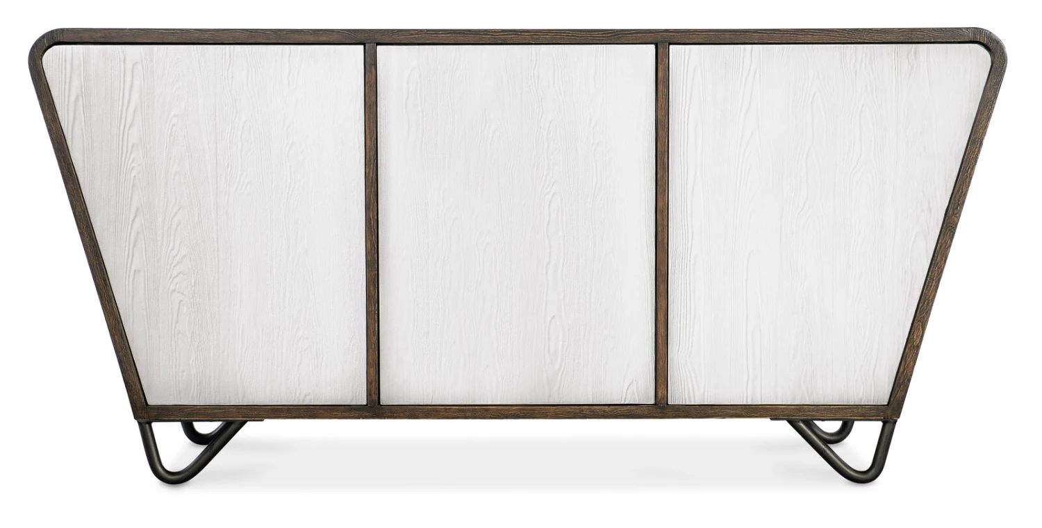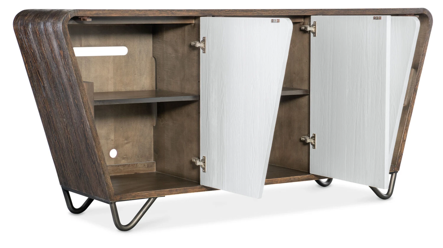 In a swanky inverted quadrangle shape, the casual modern Terra Credenza combines Pine Veneers with metal. The outside and top of the case has a dark wood finish, contrasting with white painted doors and a metal base. The three doors have soft-close hinges and magnetic door catches, with one adjustable shelf behind each door. There’s a ventilated back panel and 3-plug electrical outlet located behind the center door, making this credenza media-friendly. Rounded corners.