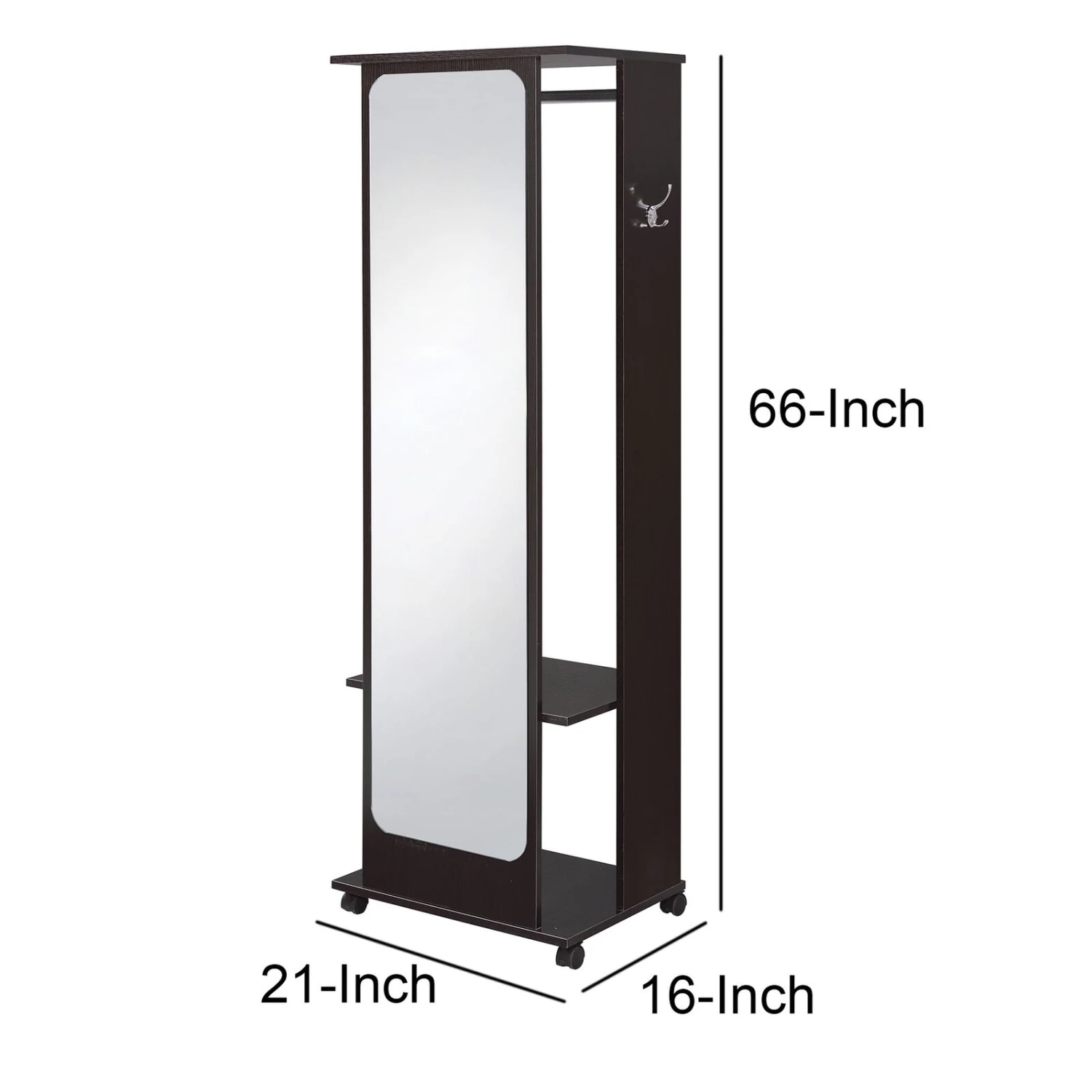 Mirror and Wood Hall Tree with Hanging Rod and Casters, Brown and Silver-Benzara