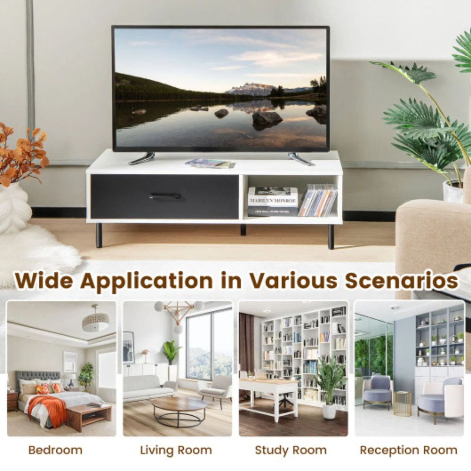 — Multifunctional Tabletop: Featuring a 43.5″ wide tabletop, the coffee table offers a flat and multifunctional surface for you to have afternoon tea or work on the laptop. In addition, the unit can also serve as a TV stand, which is compatible with 32″, 40″, 43″, 50″ TVs for binge-watching.— Practical Design of Storage Space: To meet your storage needs, the cocktail table is designed with a pull-out drawer and large open shelf, which easily accommodate private or decorative items to keep the living space tidy and clean. More details including the convenient handle and smooth and mute sliders bring a better experience.— Sturdy Construction and Additional Leg: An upgraded construction of thickened engineered wood boasts superior durability, making the TV console table hold up well and serve for long. What’s more, the 5 heavy-duty steel legs raise the cabinet from floor by 5″ to provide reliable support and leave ample room for cleaning.— Modern and Stylish Appearance: The classic color scheme and sleek appearance make the living room center table match different furnishing styles, being the finish touch of the living room decorations. Besides, comes with round white stickers, the storage cabinet looks uniform and clean without unsightly screw holes.— Easy Assembly and Maintenance: Complete hardware and step-by-step instructions are included in the package for easy assembly. Plus, the parts are fitted with corresponding labels for easy recognition. And the smooth waterproof surface requires minimal maintenance. You can easily wipe off the dirt with a soft cloth.