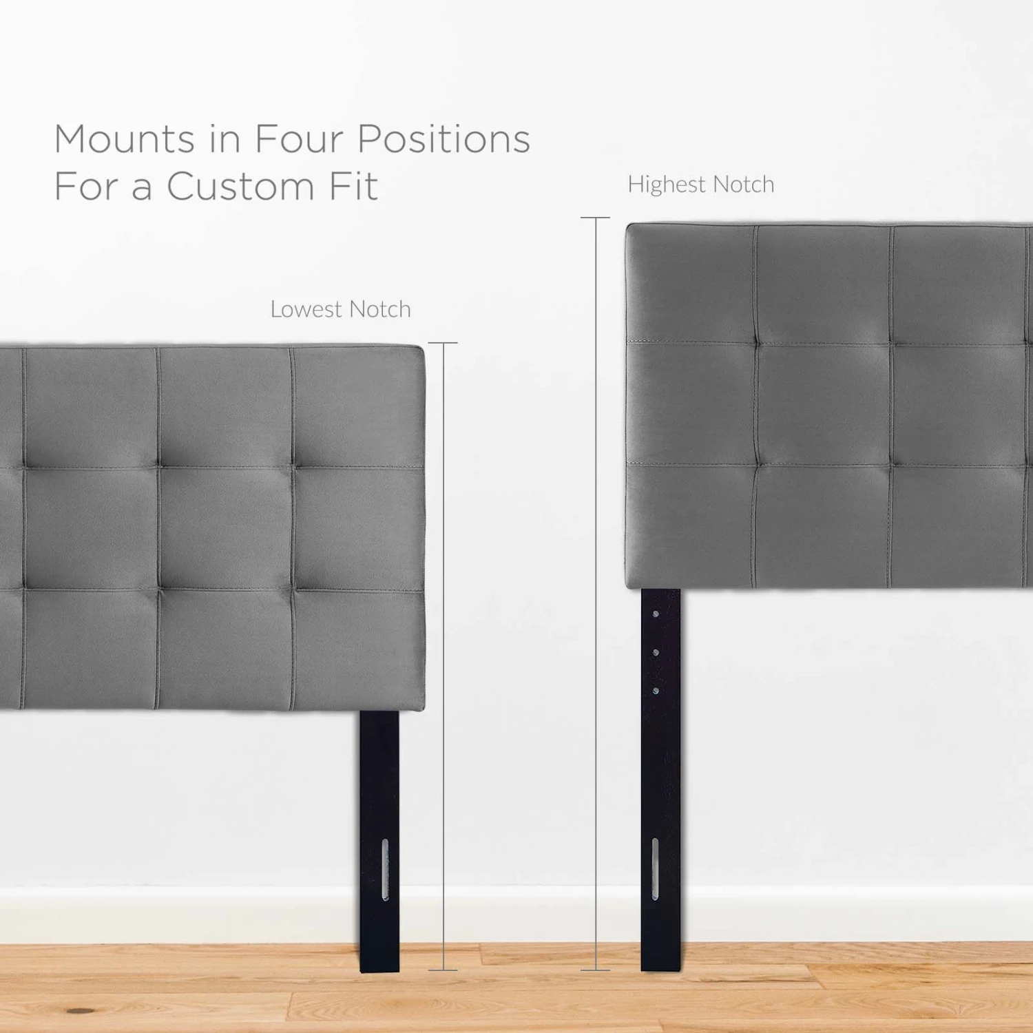 Instill classic elegance and modern luxury with the Lily Biscuit Tufted Performance Velvet Full Headboard. Lily features charming biscuit tufting for plush vintage glamour and timeless appeal. An elegant centerpiece to a teen’s bedroom, guest room, or dorm, this upholstered velvet headboard for full bed frames provides a soft, stain-resistant update for premium comfort while relaxing, reading, or conversing in bed. Solidly constructed from plywood and fiberboard with dense foam padding, this full-size velvet headboard comes with five mounting positions that are height adjustable from 45″ – 52.5″.