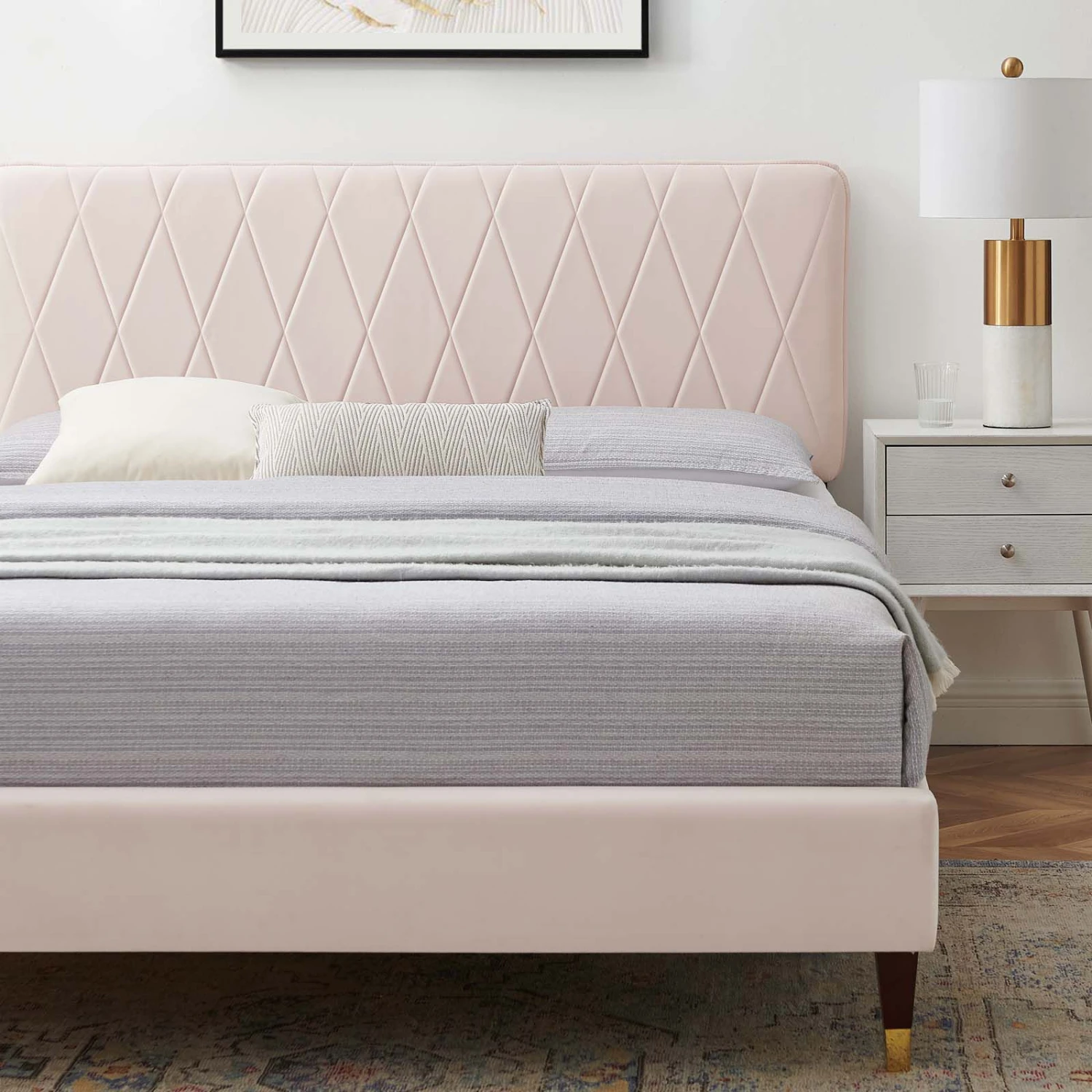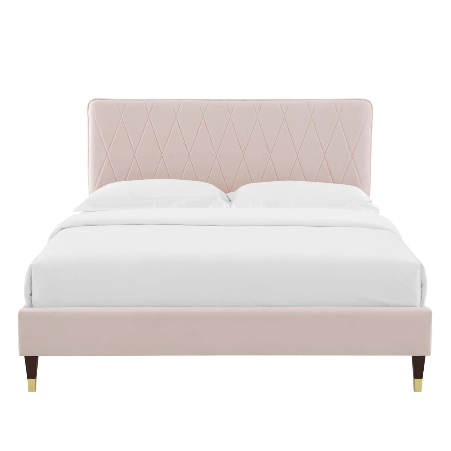 Offer glam deco style and vintage modern elegance to your master bedroom or guest bedroom decor with the Phillipa Performance Velvet King Platform Bed. The padded headboard of this king size bed features a beautiful intersecting diamond design. Rich in glam deco style and vintage modern elegance, this upholstered bed is covered in stain-resistant performance velvet and is a sturdy mattress foundation for memory foam, innerspring, latex, and hybrid mattresses. Eliminating the need for a box spring, the MDF frame of this king platform bed is complete with a wood slat support system crafted with poplar for lasting durability and support. This slatted bed frame rests on wood legs with gold metal sleeves and non-marking foot caps and includes a reinforced center beam with two support legs for enhanced stability. Assembly required. King Bed Weight Capacity: 800 lbs.