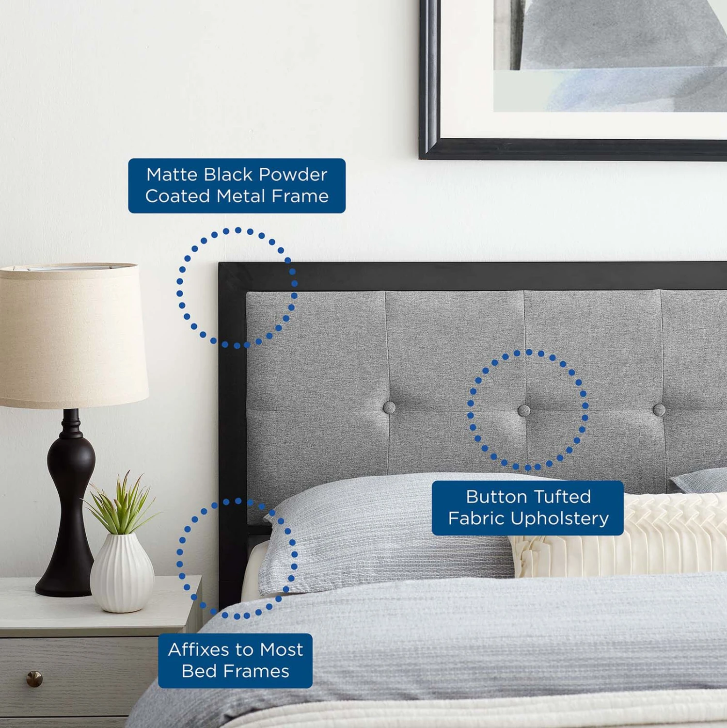 Reinvent the surroundings in your master bedroom or guest bedroom with the Teagan Tufted Fabric King Headboard. Rich in modern elegance and retro style, this king size headboard boasts clean lines, soft texture, and classic tufted buttons. The Teagan Upholstered Headboard is covered in soft fabric and is padded in dense foam to offer supportive comfort while sitting up in bed reading, relaxing, or watching TV. Powder coated metal makes up the frame of this headboard for king beds for a construction that lasts. Teagan affixes to almost any king size bed frame creating a stunning backdrop for a variety of bedding and sham styles.