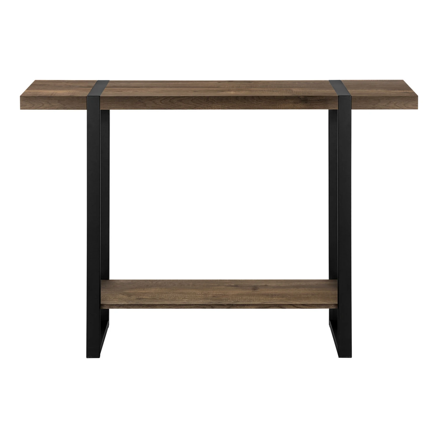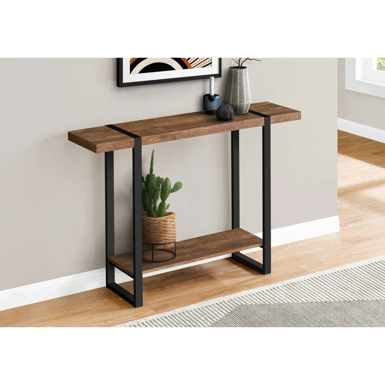 Industrial-farmhouse style combines modern metal with a rustic wood finish to create a warm, inviting look. This two-tier rectangular console table embodies that popular style. The tabletop and bottom shelf are finished in a brown reclaimed-wood look with naturalistic color variations and a subtle wood-grain texture. Robust metal legs in a black finish are incorporated into the thick tabletop for a striking visual contrast and to provide stability. This accent table has a narrow profile that makes it ideal for use in an entryway, hallway, or behind a sofa in a living room.