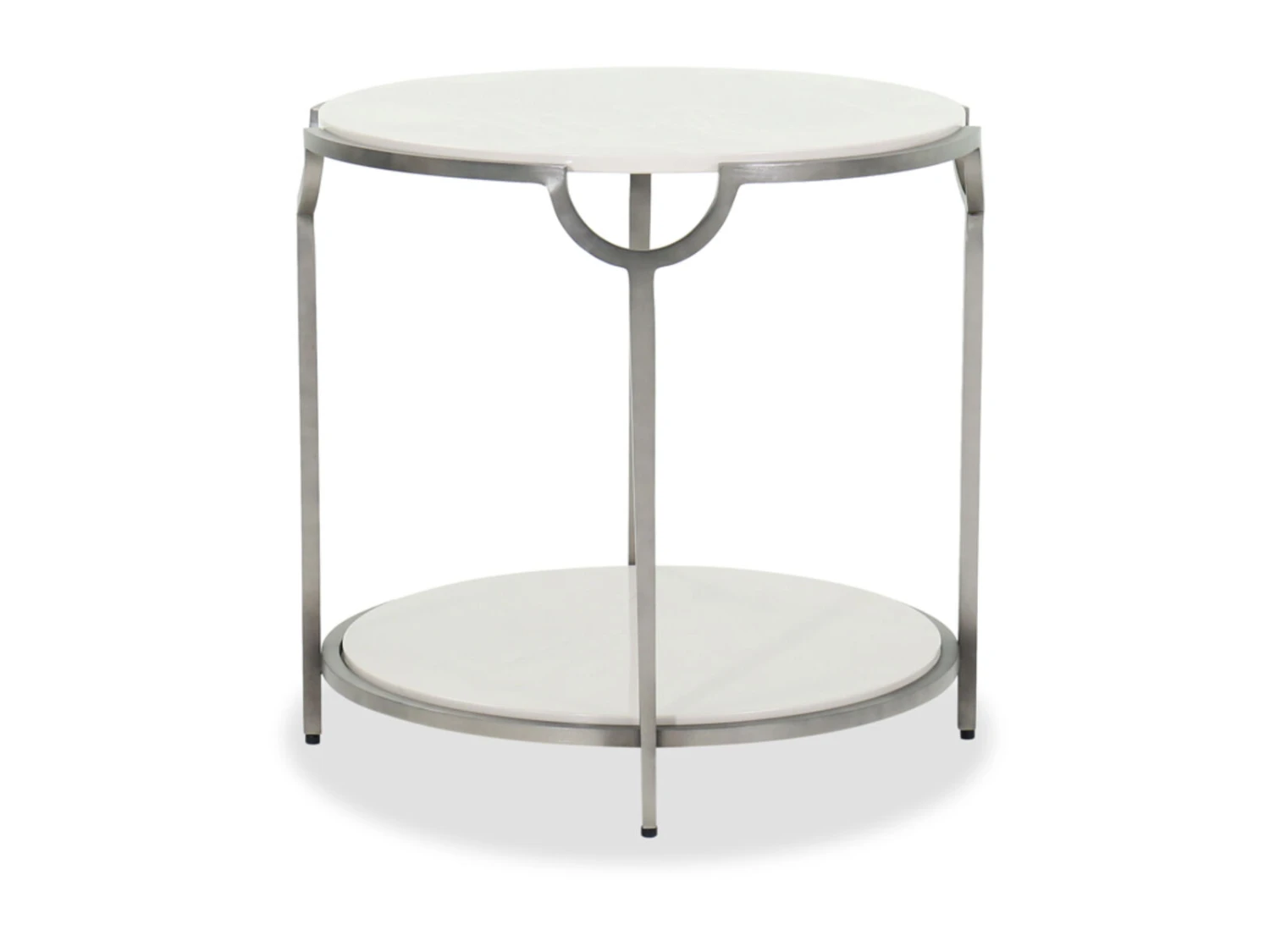Sporting a sleek and sophisticated style, the Morello End Table brings visual appeal as well as function. It has a round top surface for holding items and a bottom rack which can be utilized to keep frequently used items within reach. Faux Carrera marble shelves with a solid frame made from steel provide a stable and sturdy build that will last for many years.