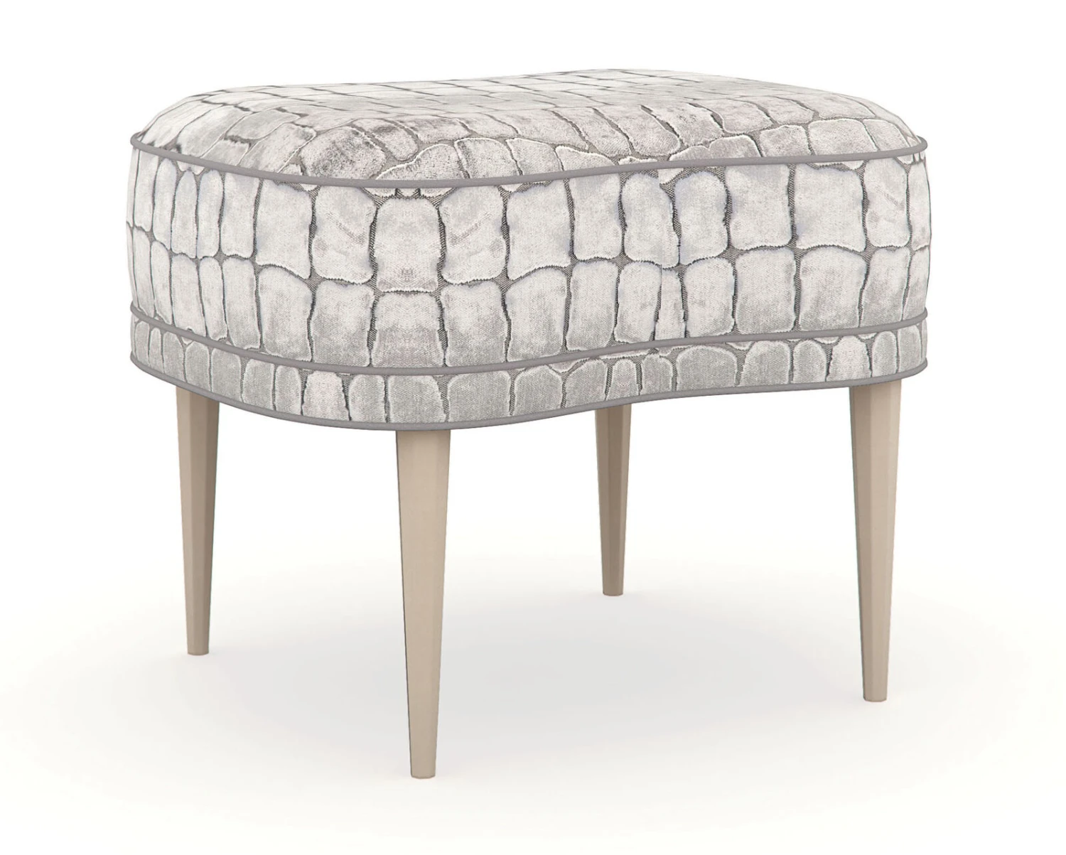 Creating visual interest and tactile intrigue, this fashionable accent ottoman makes a glamorous statement dressed in a shimmering, mosaic-style cut-velvet. Contrast welt artfully accents its subtly curved silhouette, complemented by slender tapered legs in Taupe Silver Leaf. Style in pairs at the end of the bed, or tuck beneath a console for impromptu extra seats.