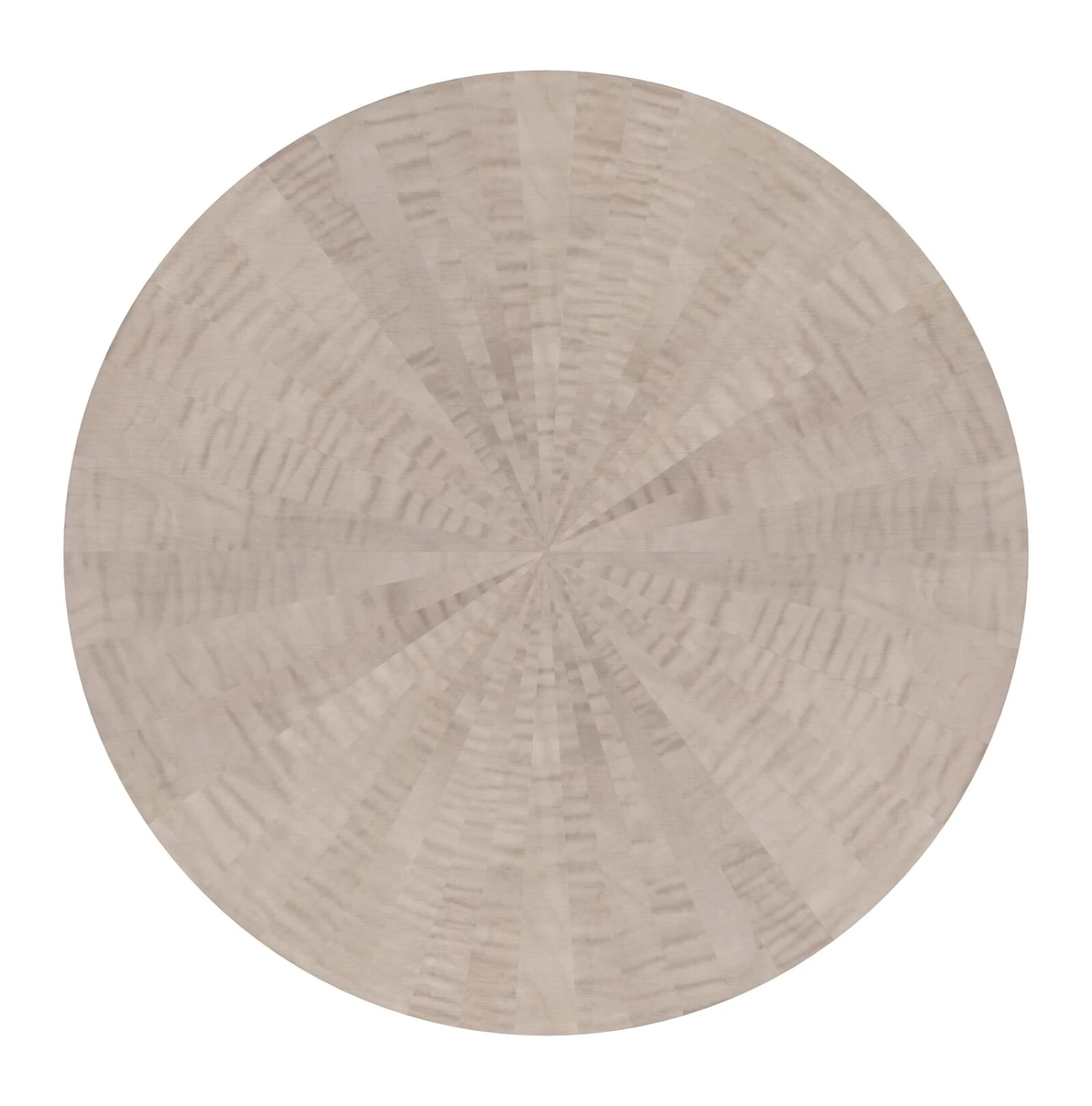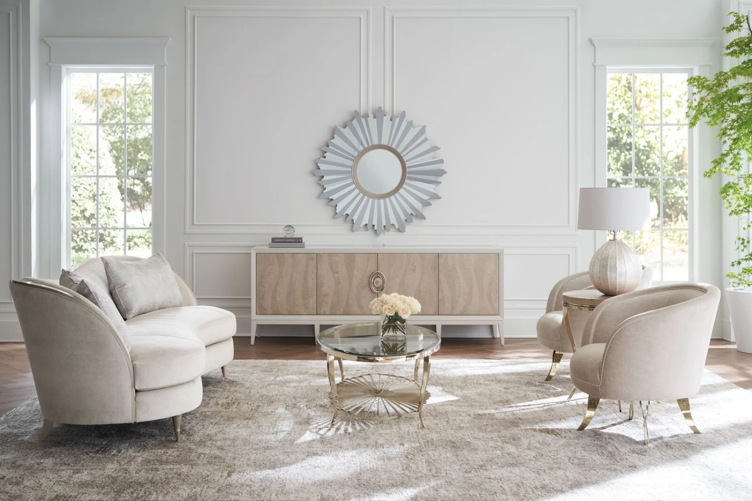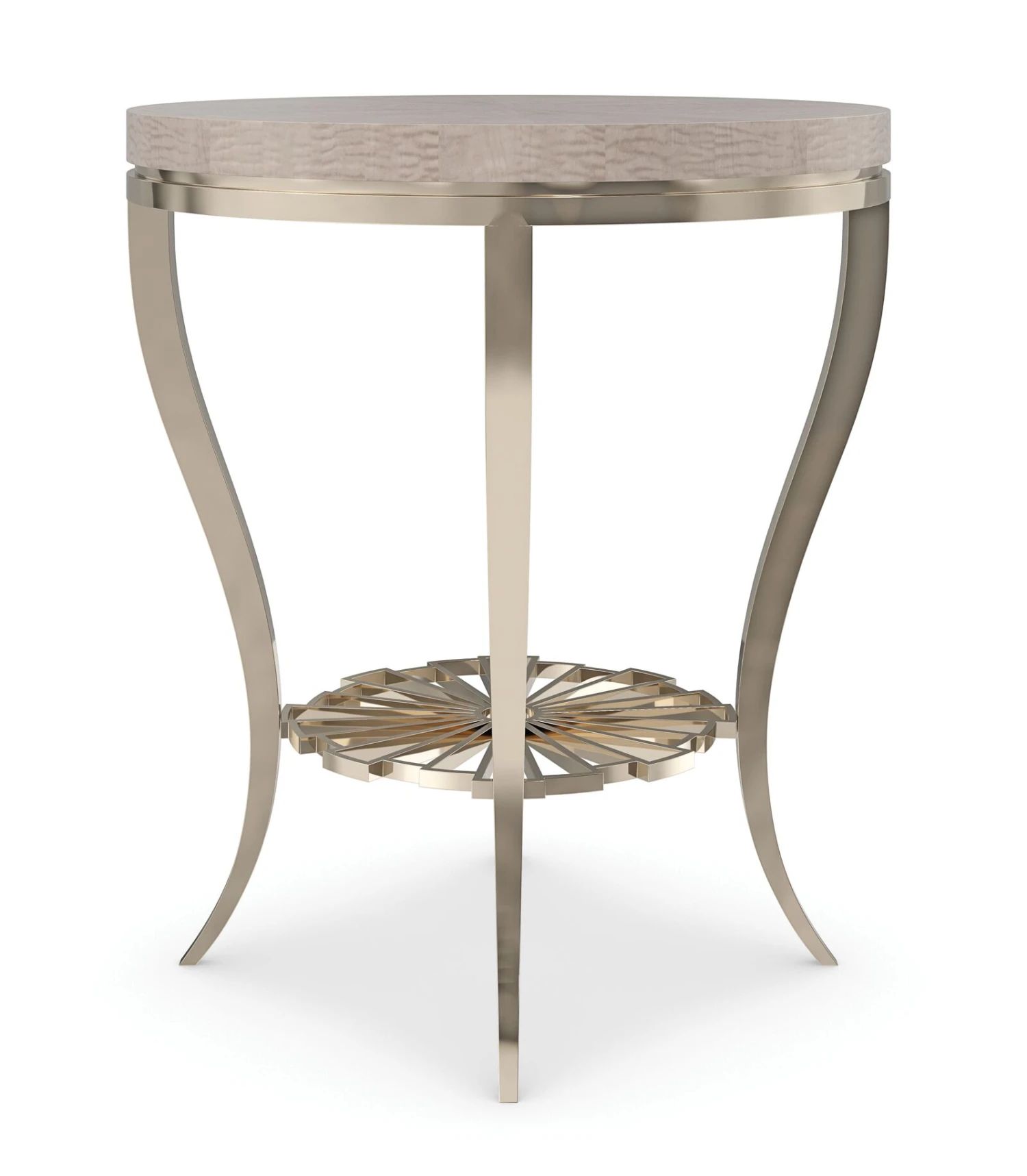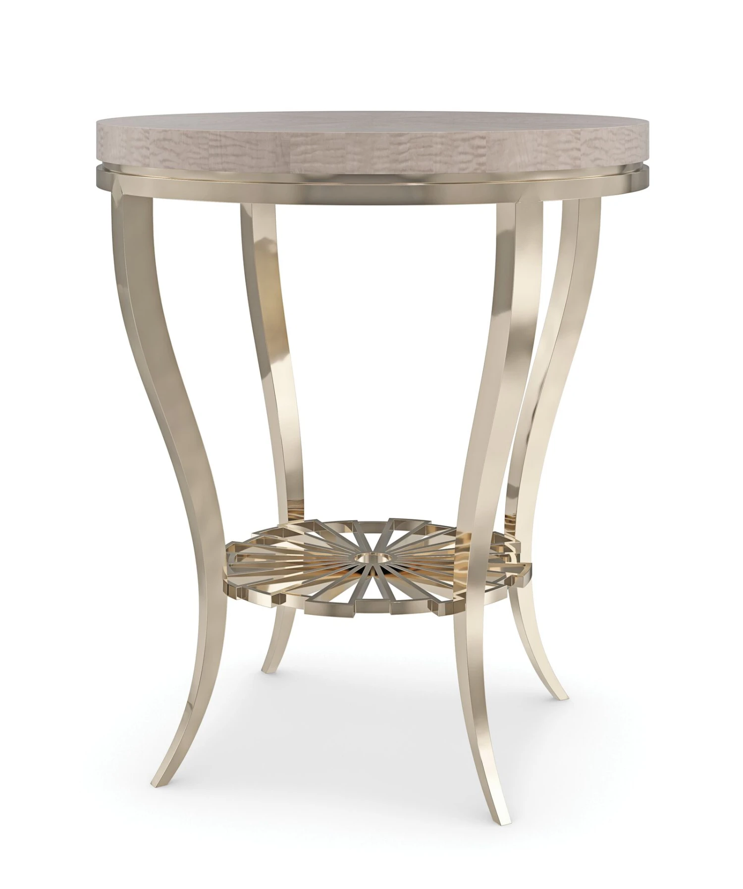 Poised to make a dramatic impression, the Plie’ accent table draws the eye with an Art Nouveau-inspired, fanfold metal stretcher that doubles as a small shelf. A warm Chinchilla finish illuminates a radiating wood grain on top, intricately crafted from grey curly maple veneers. Square saber legs lend contemporary flair to its ornate frame in a Whisper of Gold.