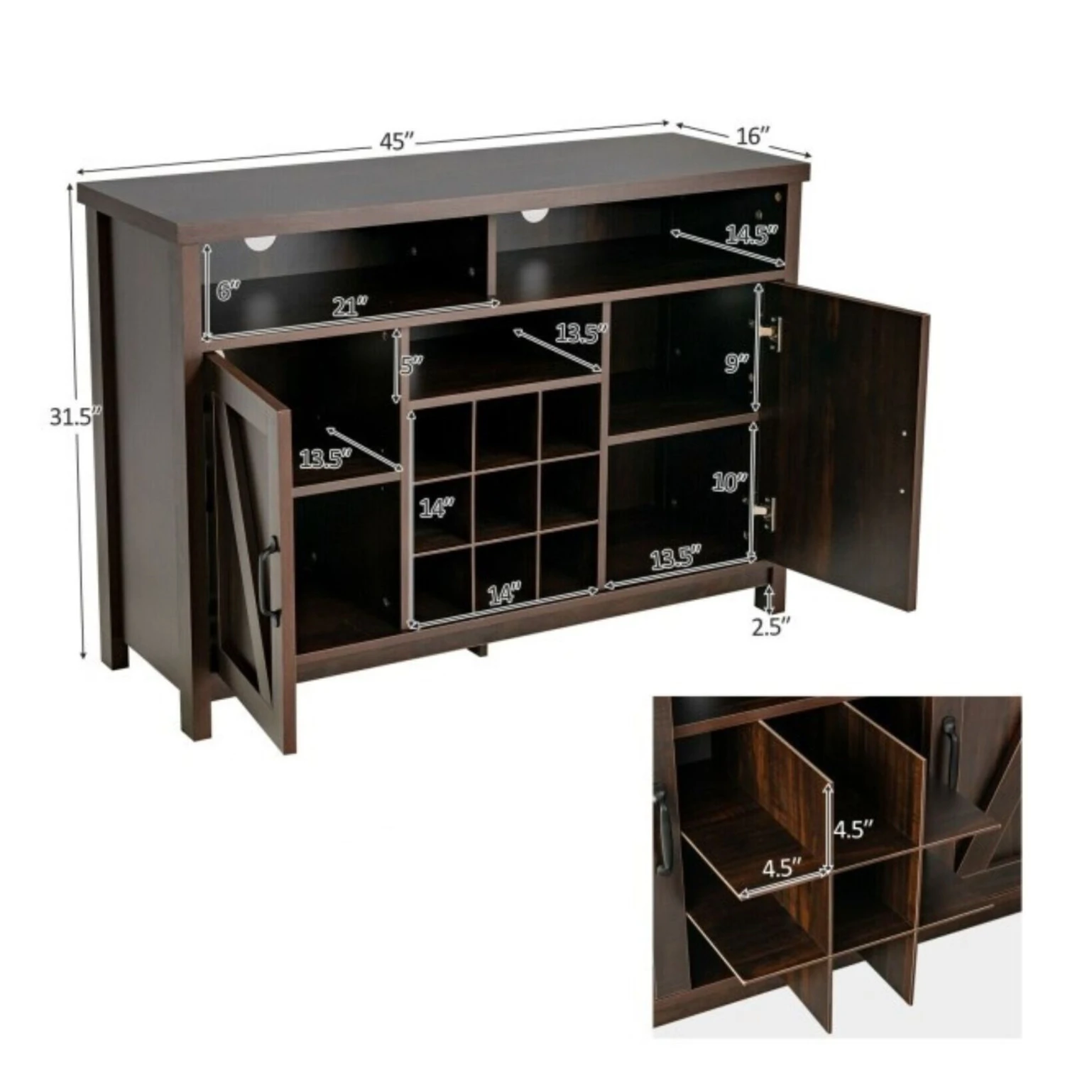 Rustic Espresso Detachable 9 Bottle Wine Rack Kitchen Buffet Storage Cabinet
