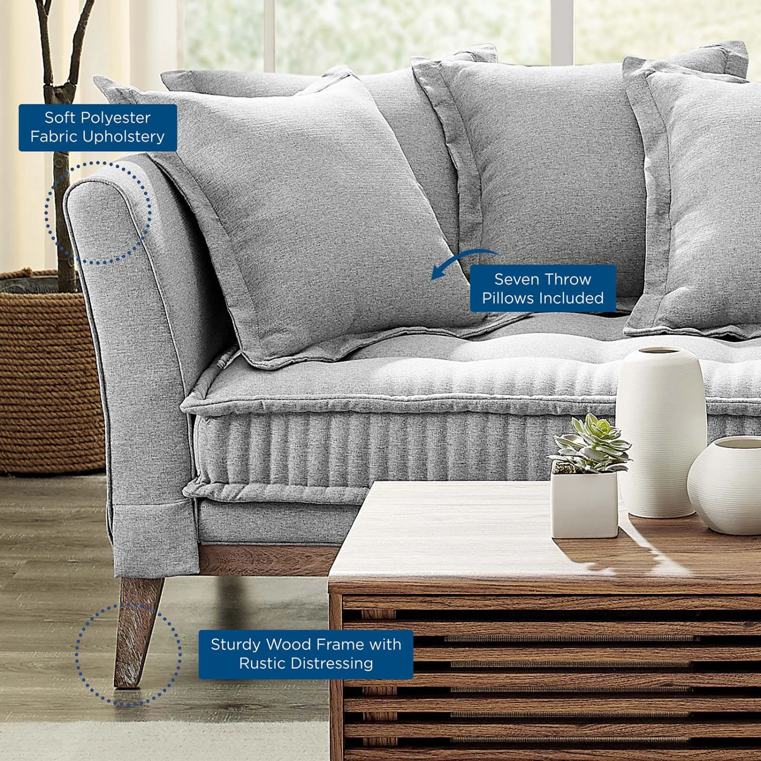 Inspire calming comfort and relaxed style in your living space with the Rowan Fabric Sofa. Inviting guests to sit and stay for a while, this living room sofa features a casual yet tailored design brimming with modern farmhouse charm. Resting atop a sturdy wood frame with rustic distressing, this sofa grants a premium seating experience thanks to its soft fabric upholstery, seven throw pillows, and dense foam padding. Shipping directly to your doorstep, this sofa modernizes the traditional furniture shopping experience. Sofa Weight Capacity: 1322 lbs.