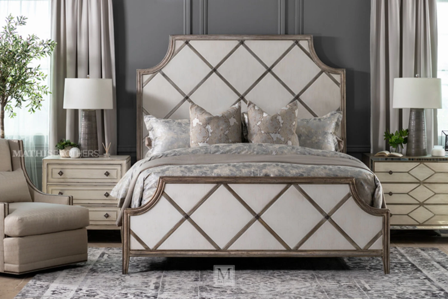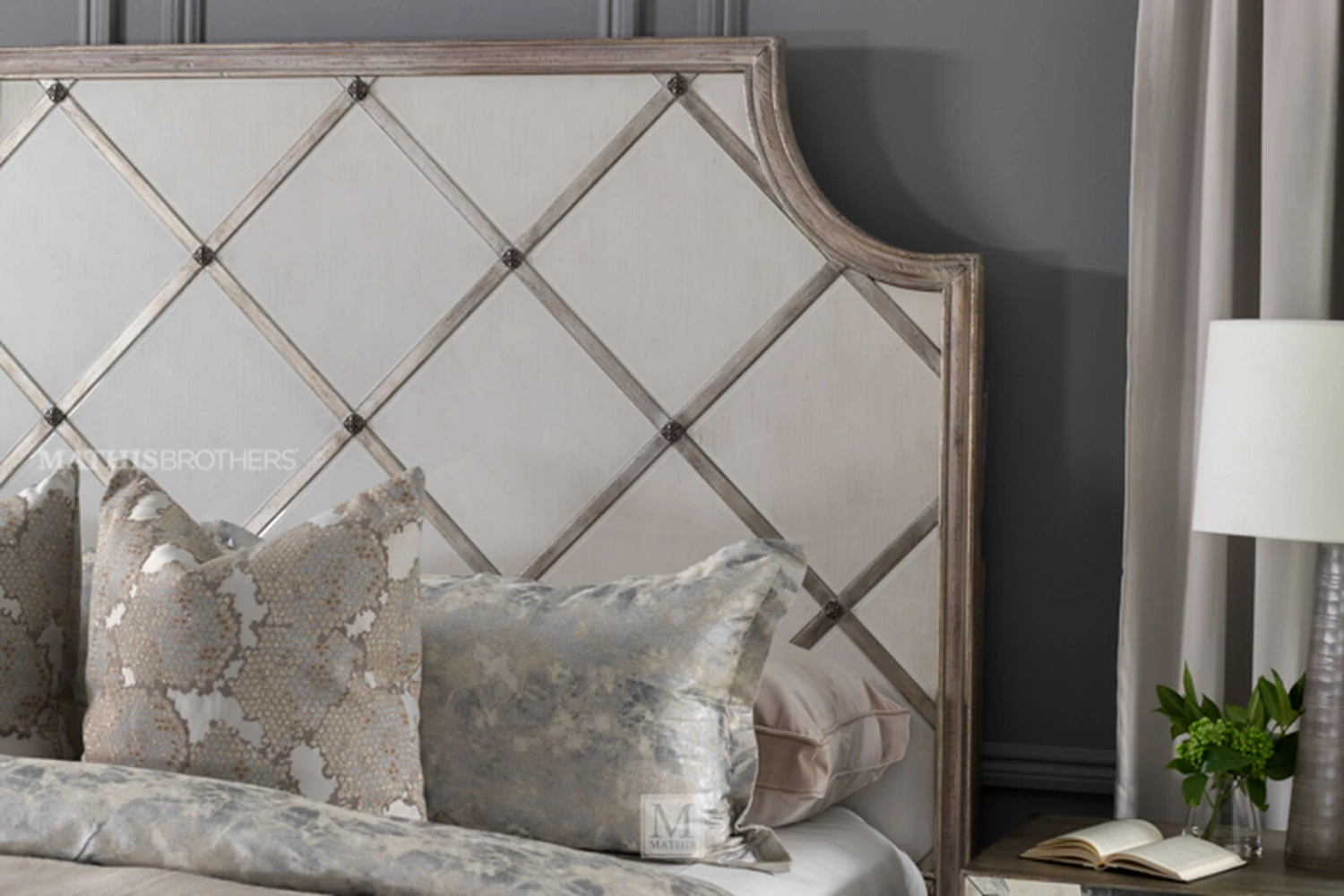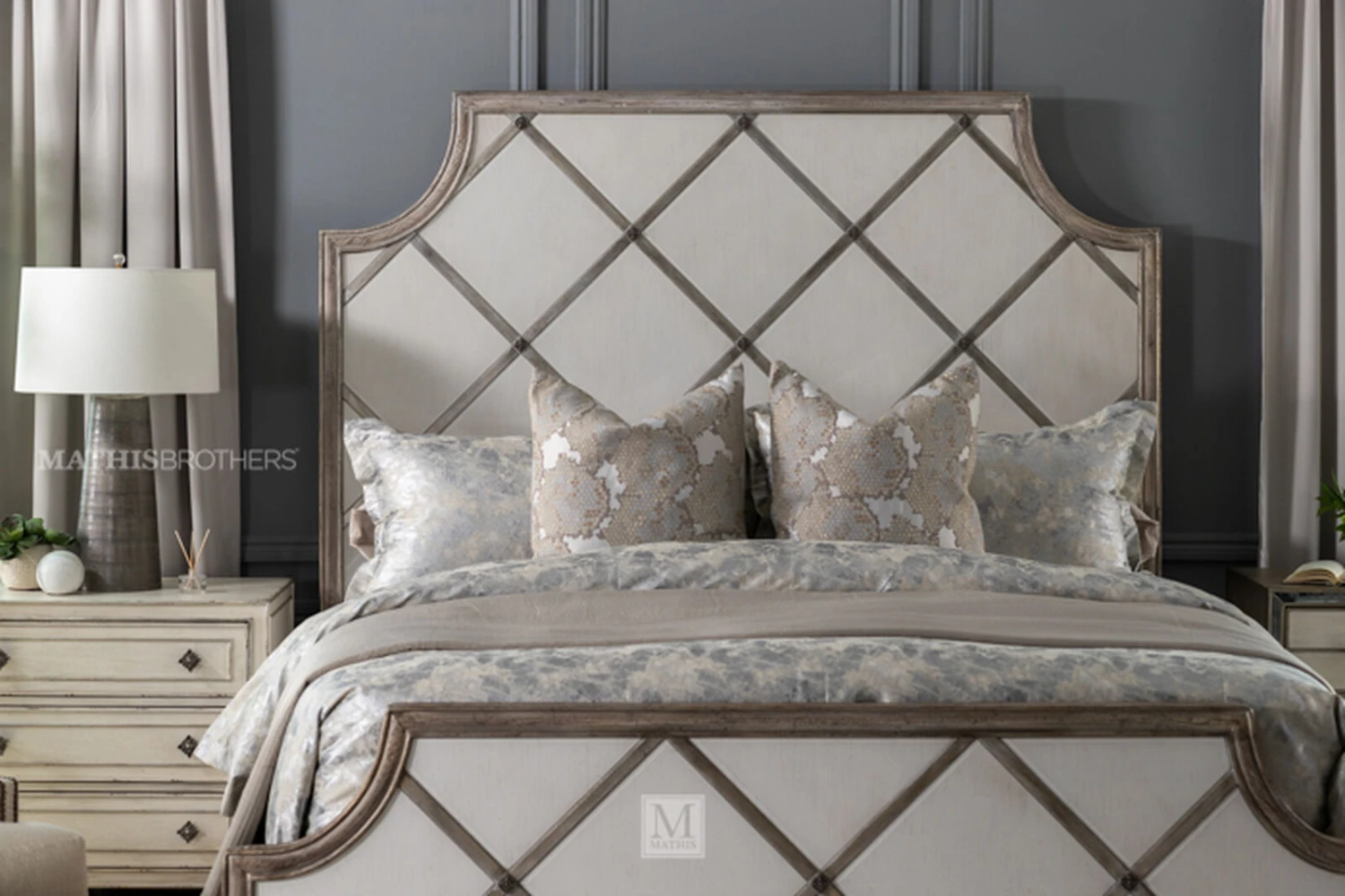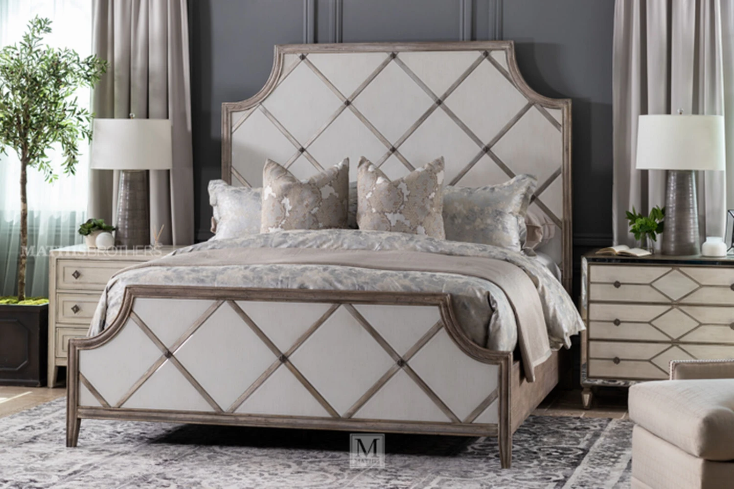 Beautifully detailed, the 76″ Traditional King Paneled Bed is an embodiment of luxury and sophistication. Featuring silver leaf and eglomaise, this bed magnifies the visual appeal of your bedroom. Panels of merinque overlaid with diamond fretwork on the headboard and footboard adds to the lavishness of your bedroom. The durable hardwood and oak construction ensures that this bed will grace your bedroom for decades.