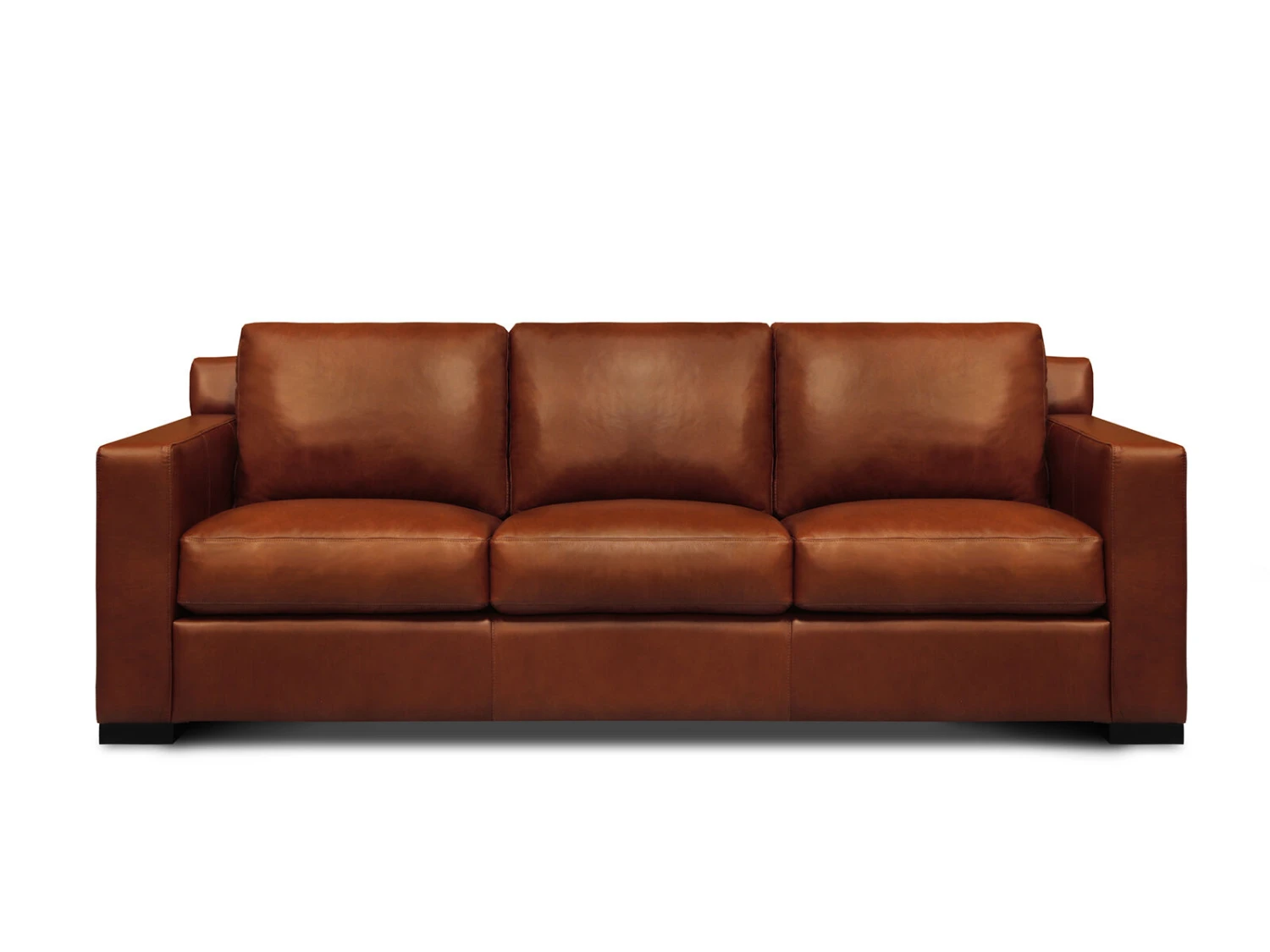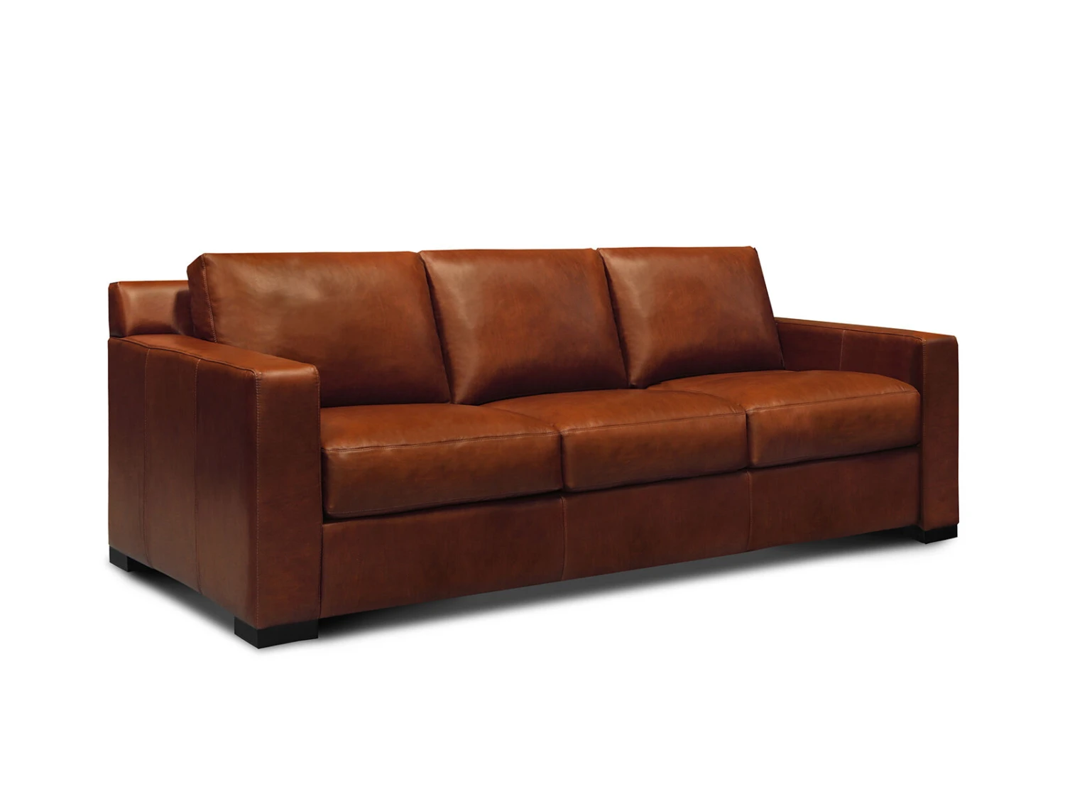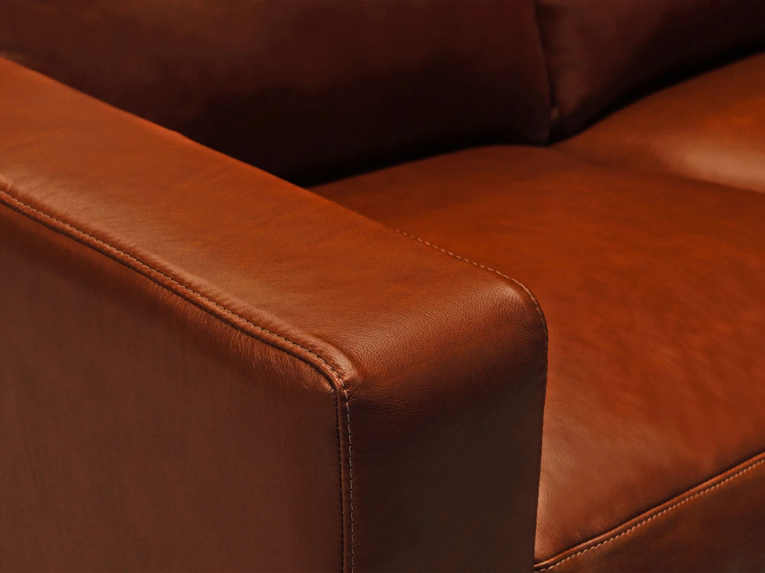 Expertly built from top grade materials, the Santiago line is sure to take pride of place in any living room. The supple top grain leather is buttery to the touch, and the soft buffing keeps a hint of the hide’s natural texture. Made in North America, our factory pays loving attention to each detail. From the corner blocked hardwood frame, to the individually pocketed seat coils, to the heavy duty back suspension, this sofa is built to last. This model has the most pristine hide used to upholster leather furniture. It is a full grain article meaning that the leather has not been altered from its natural state other than the dyeing process. The inherent beauty of it’s unique shading and characteristics is on full display. A full grain article is the epitome of pristine leather, as indicated by the large swaths of leather without seams.