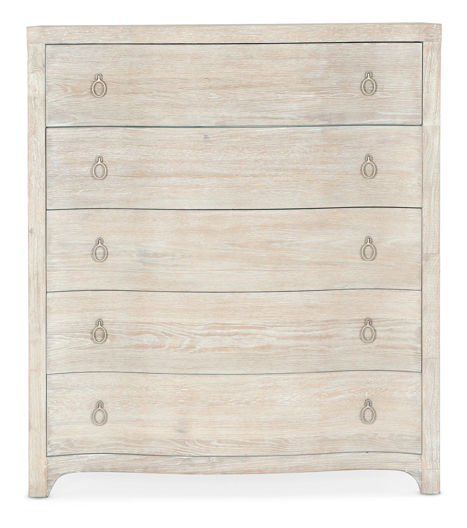 If you aspire to calming palettes and textures, the Serenity Monterey Chest will bring the peacefulness of the outdoors inside with its light and airy whitewashed Surf finish over Oak Veneers. Featuring 5 roomy drawers, the top drawer has a removable black felt liner and the bottom drawer is cedar-lined. Light champagne ring pulls add a touch of sparkle and polish.