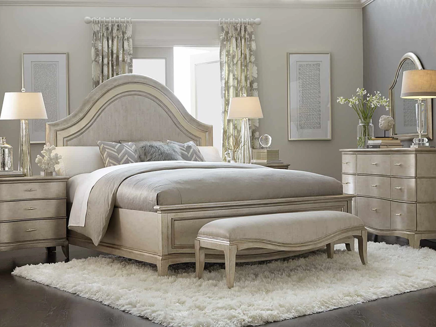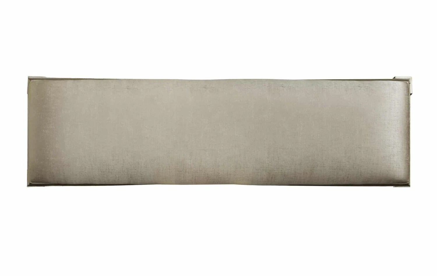 With its curved frame and gently splayed sabre legs, the Starlite Bed Bench brings a touch of high luxe to the bedroom. The neatly tailored seat is complemented by silver Bezel paint that has been glazed and gently aged for a soft sheen