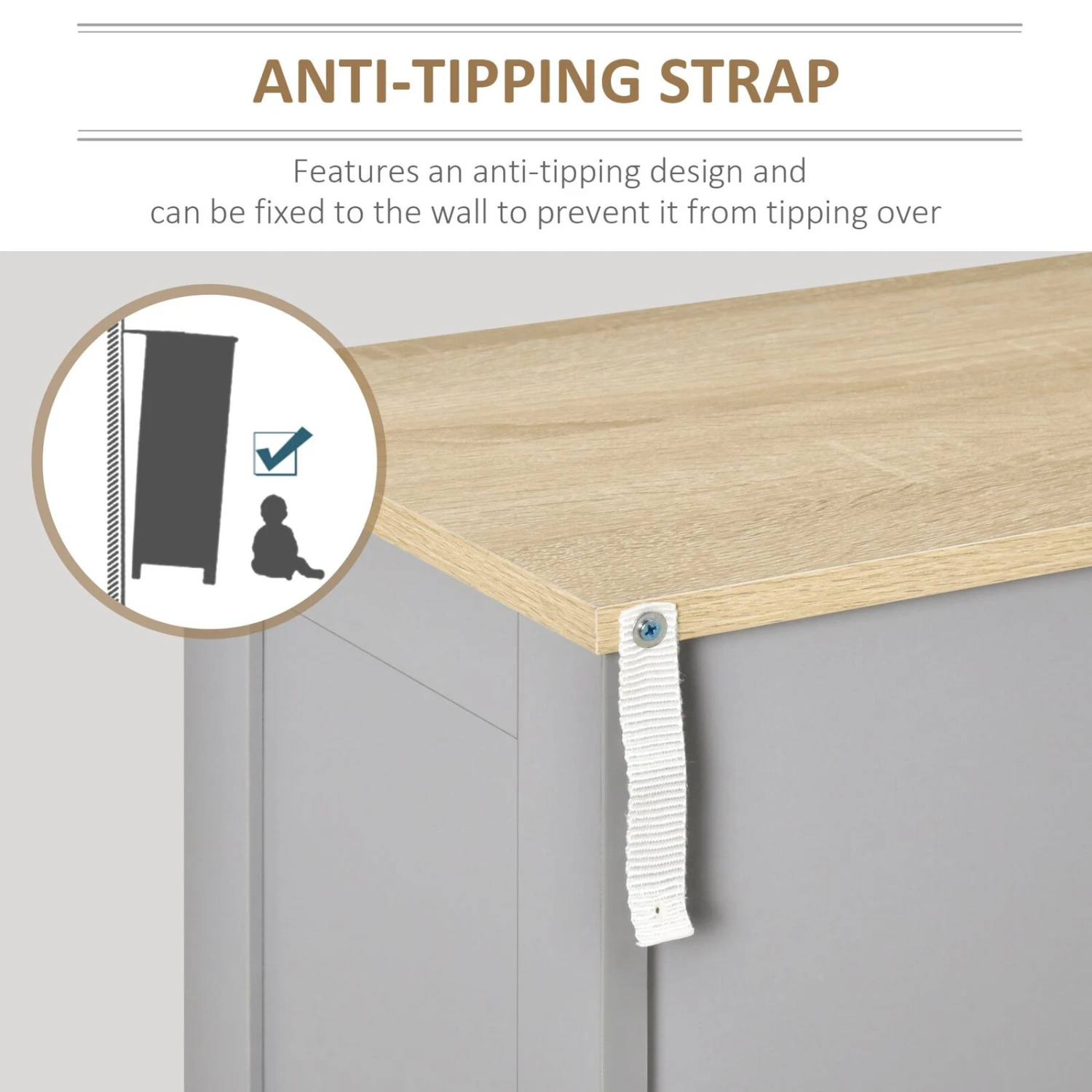 - – Safety First This freestanding accent cabinet features anti-tipping straps that can be fixed to the wall to prevent it from falling over.