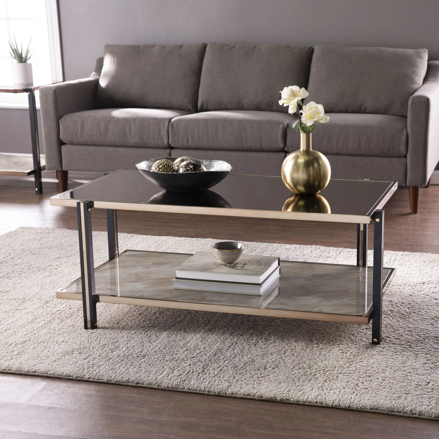 Reflect on your good taste with this mirrored cocktail table. The spacious tabletop offers a clean design, while the lower shelf keeps books and magazines tidy. A champagne-hued frame wraps around the smoky mirrored tabletop, crafting an elegant design in front of your living room sofa or alongside a pair of armchairs in the den. Add extra storage without sacrificing your style when you bring home this mirror-topped and faux marble cocktail table.