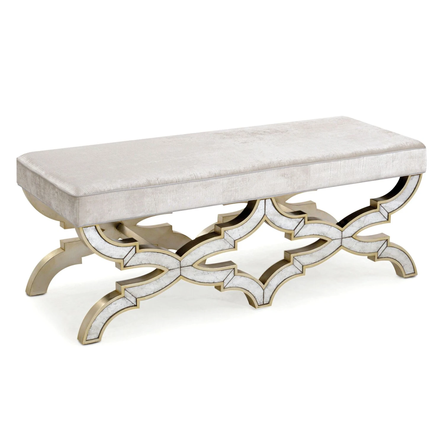 A double bench in églomisé and champagne moldings is upholstered in Notre Dame Smoke with Noble Platino welting.