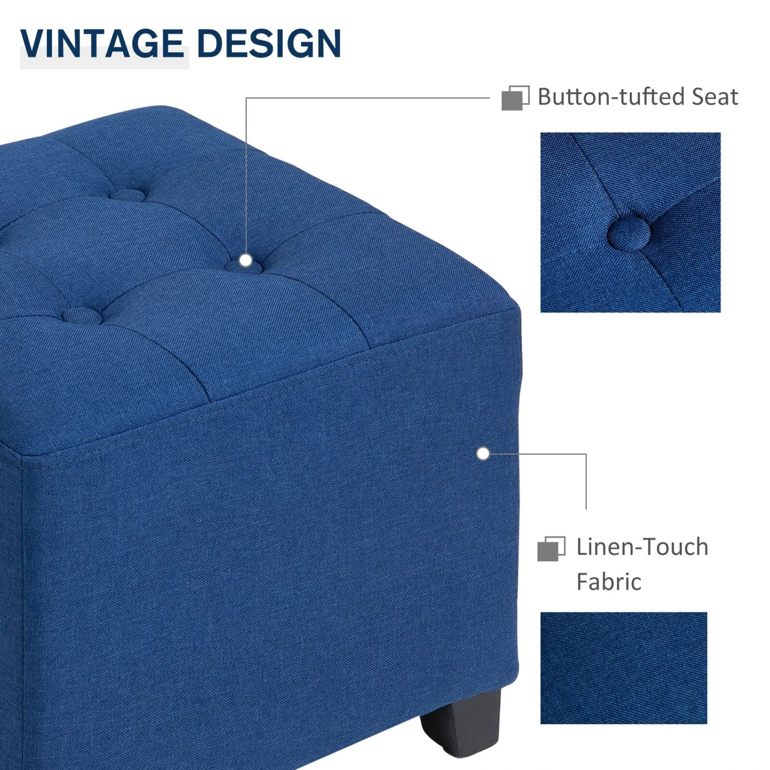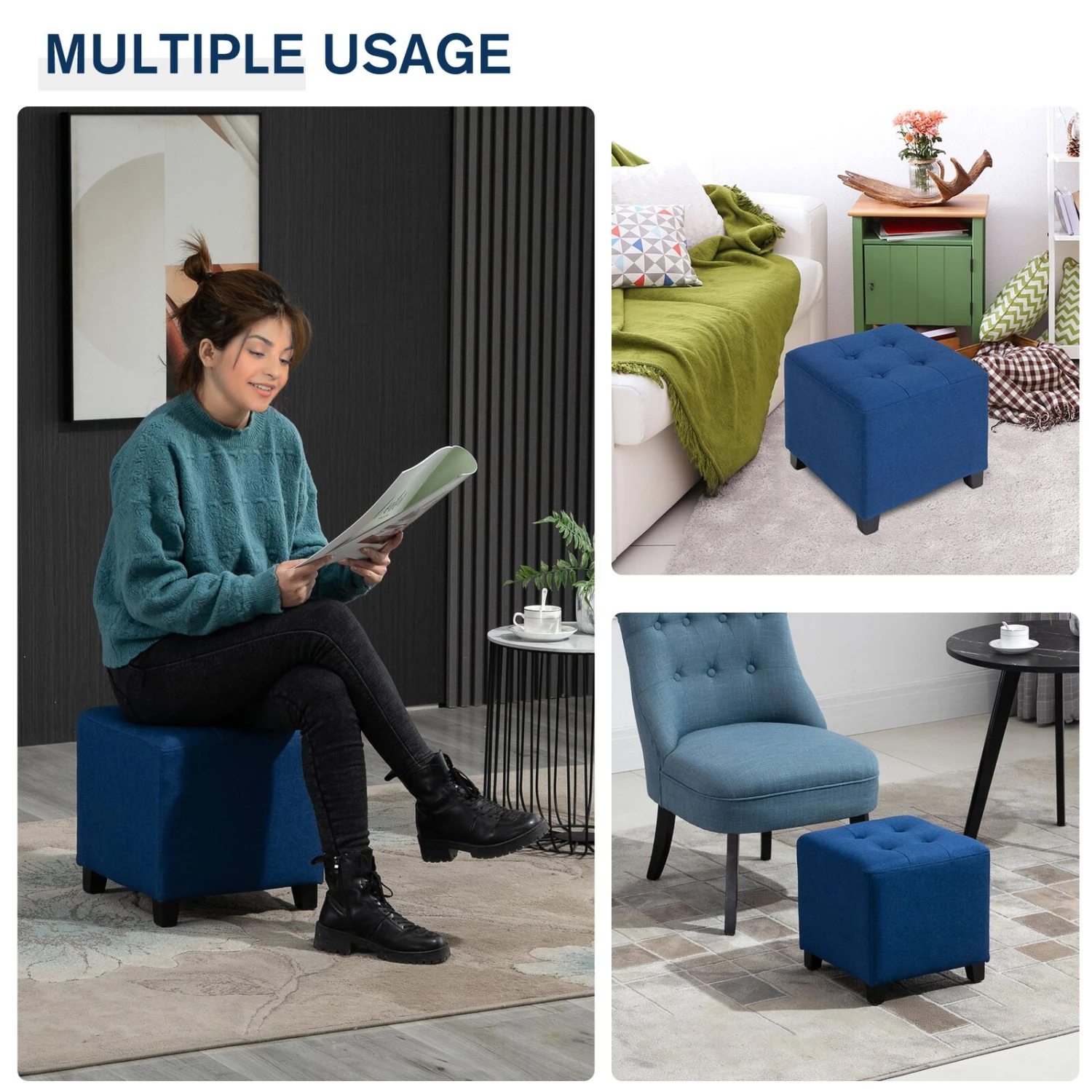 Tufted Ottoman Linen-Touch Fabric Upholstered Footrest Stool with Anti-Slip Pads, Blue