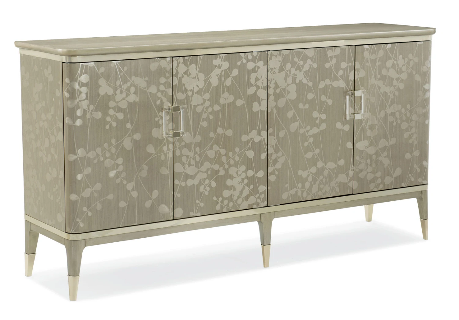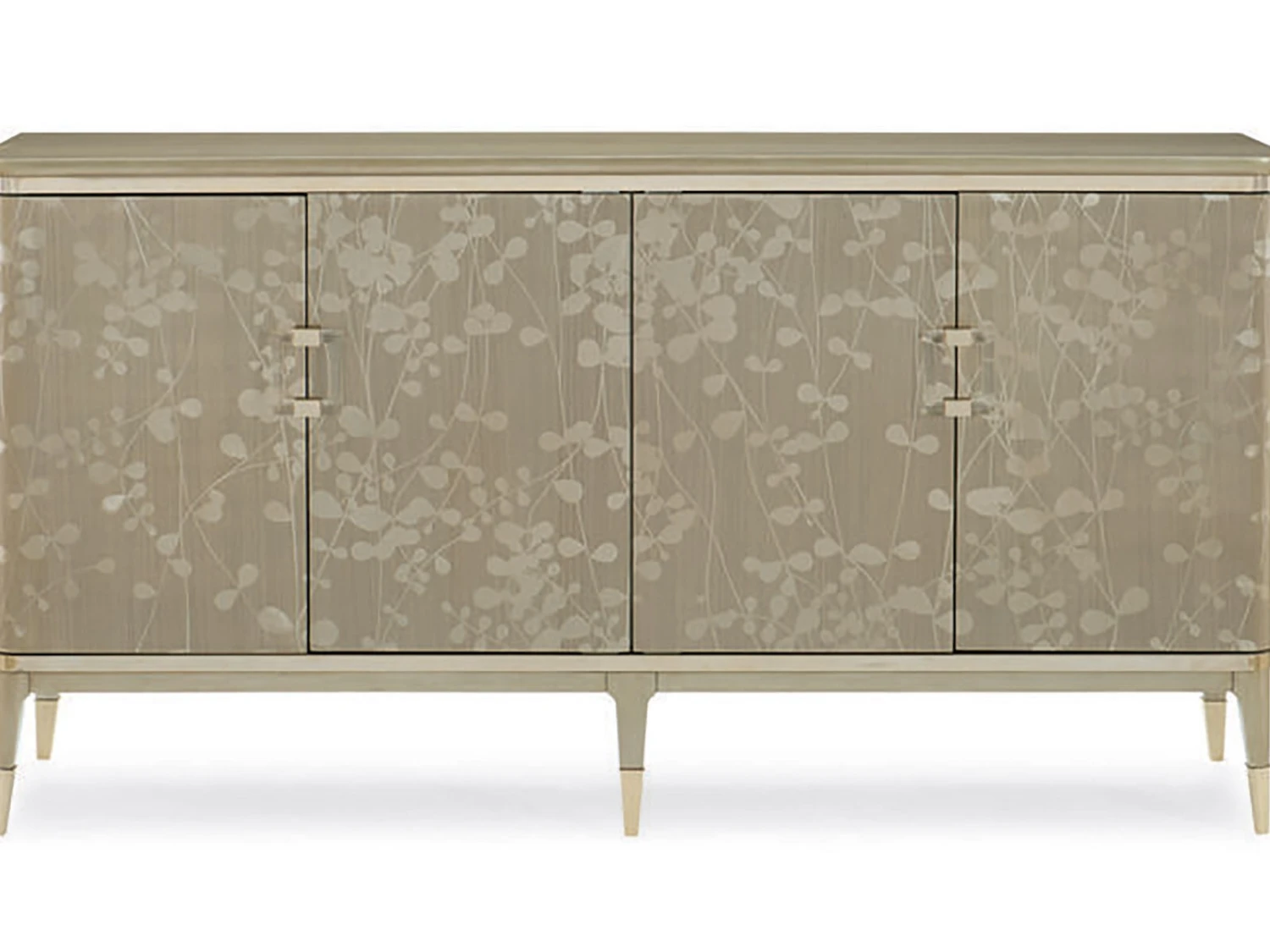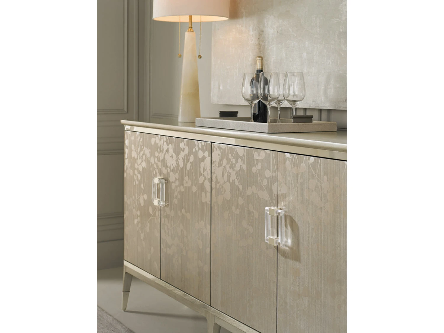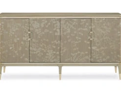 Champagne leaves intertwine in a contemporary, arabesque pattern that wraps round this piece to make it a standout design. The narrow buffet shows off the elegance of Koto wood, finished in glowing Champagne Shimmer. Its radiant aura is perfectly accented with two metallic Whisper of Gold bands and ferrules that add just the right touch of sparkle to this four-door piece with a pull-out, drop down drawer (with cord access) and three adjustable shelves. With elegant detailing, and dramatic custom crystal hardware, this silhouette is perfect for entertaining or as an accent piece that draws your eye to its beauty.