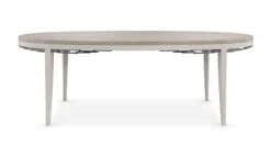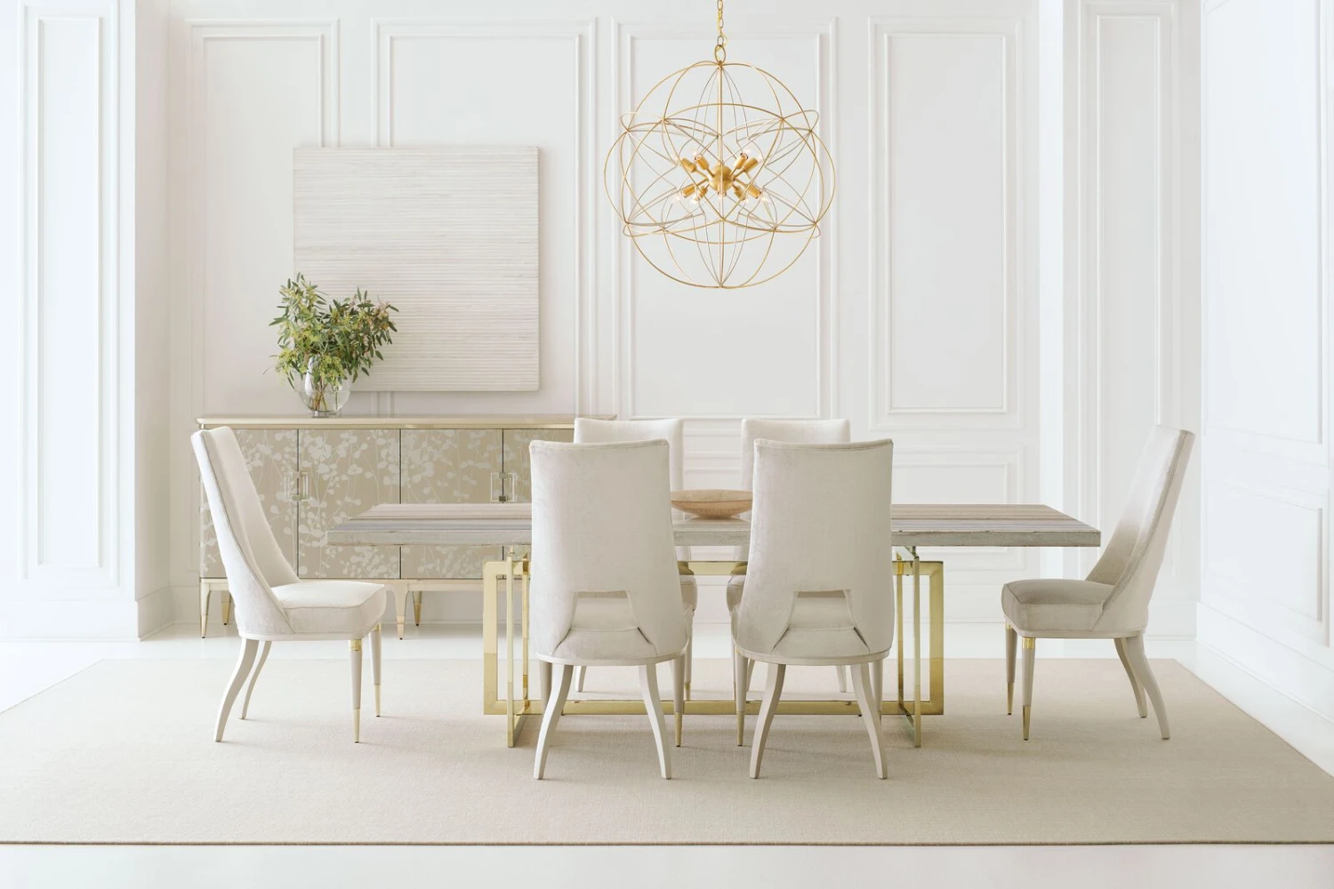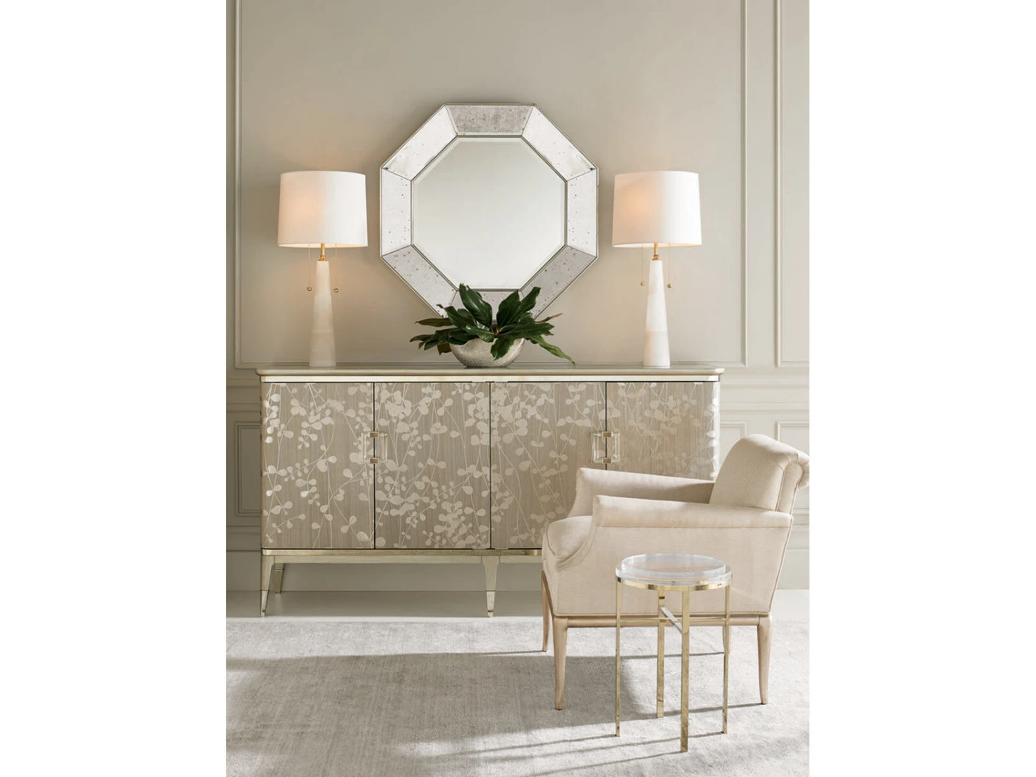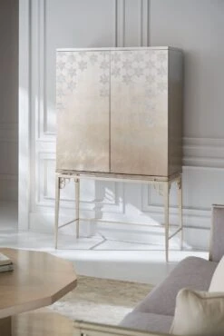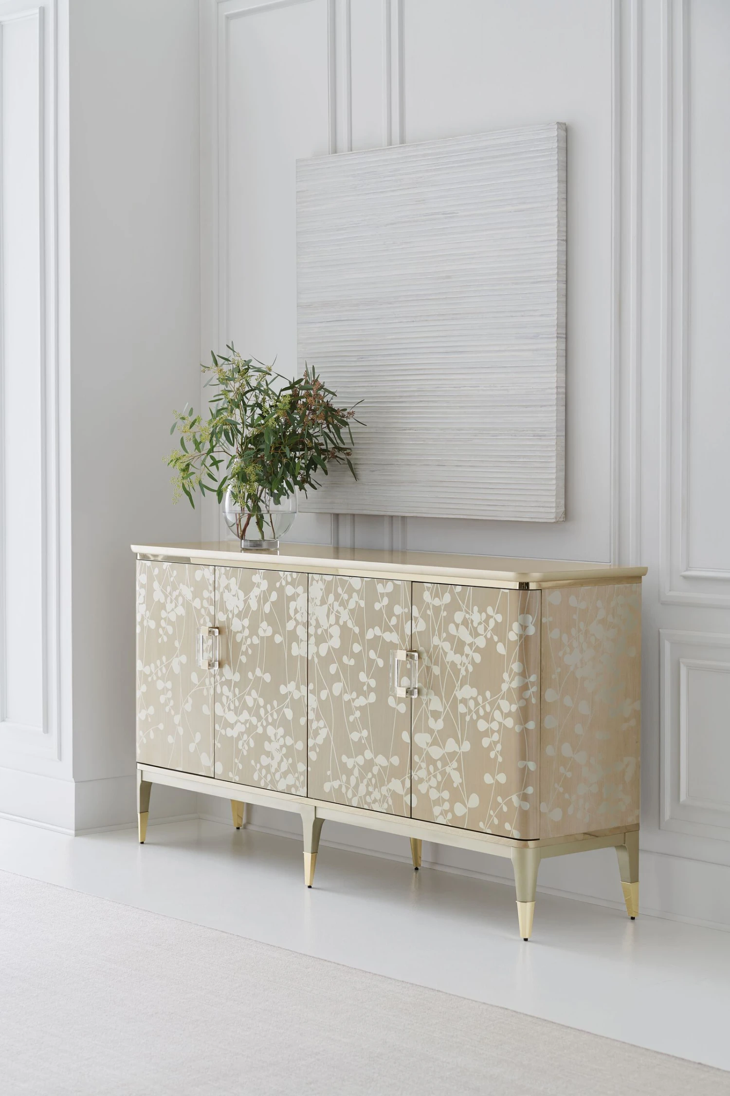 Champagne leaves intertwine in a contemporary, arabesque pattern that wraps round this piece to make it a standout design. The narrow buffet shows off the elegance of Koto wood, finished in glowing Champagne Shimmer. Its radiant aura is perfectly accented with two metallic Whisper of Gold bands and ferrules that add just the right touch of sparkle to this four-door piece with a pull-out, drop down drawer (with cord access) and three adjustable shelves. With elegant detailing, and dramatic custom crystal hardware, this silhouette is perfect for entertaining or as an accent piece that draws your eye to its beauty.