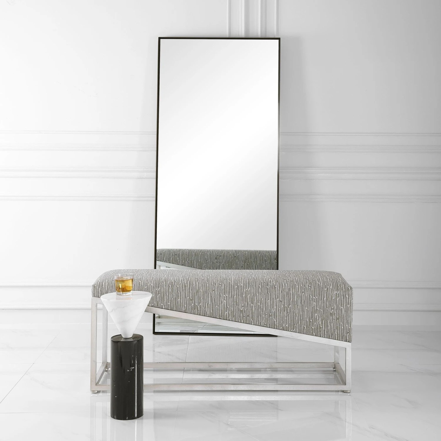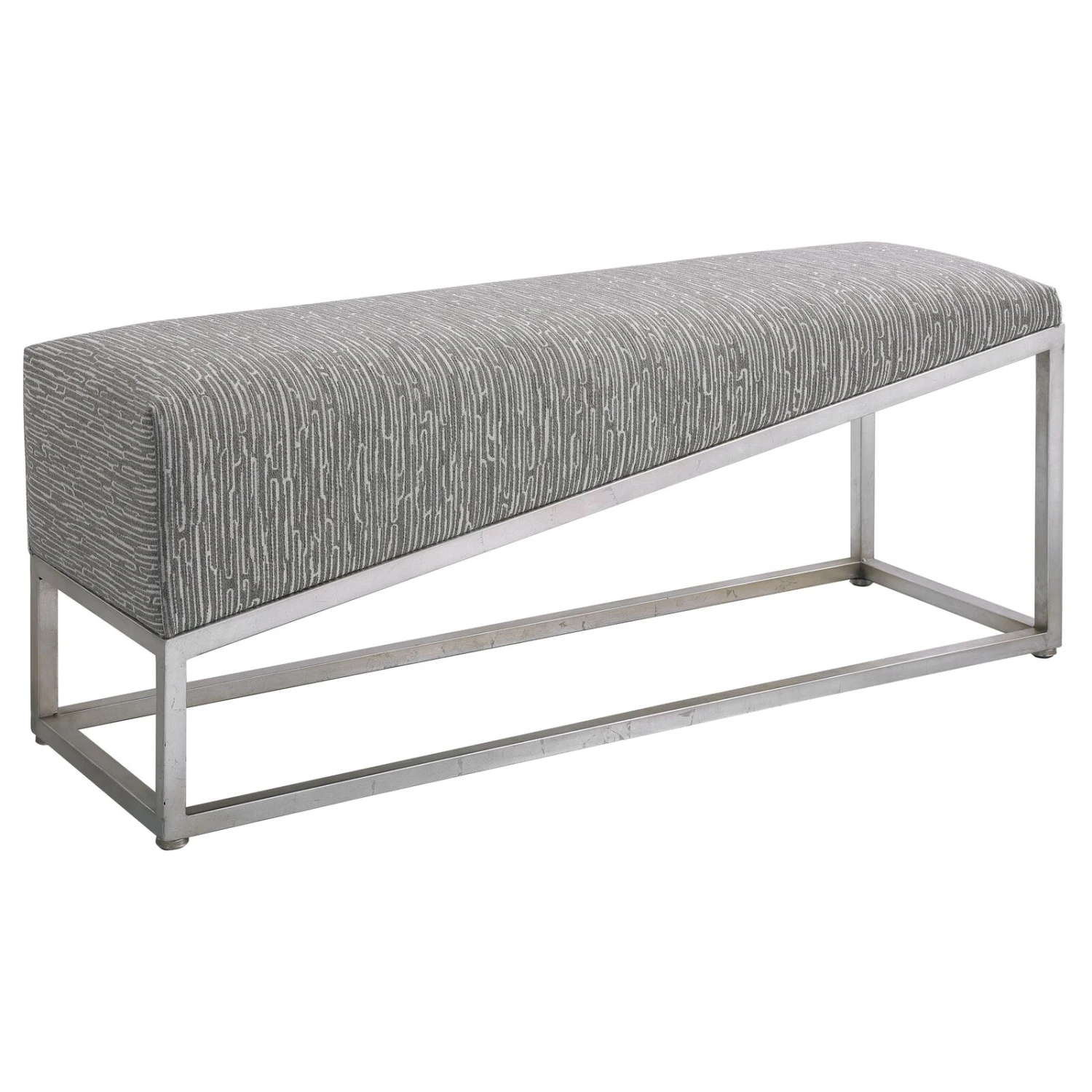 Showcasing Sleek Angular Lines, This Bench Is The Perfect Modern Accent. The Forged Iron Base Is Finished In Brushed Silver Leaf And Is Accented By A Medium Gray And White Geometric Fabric.