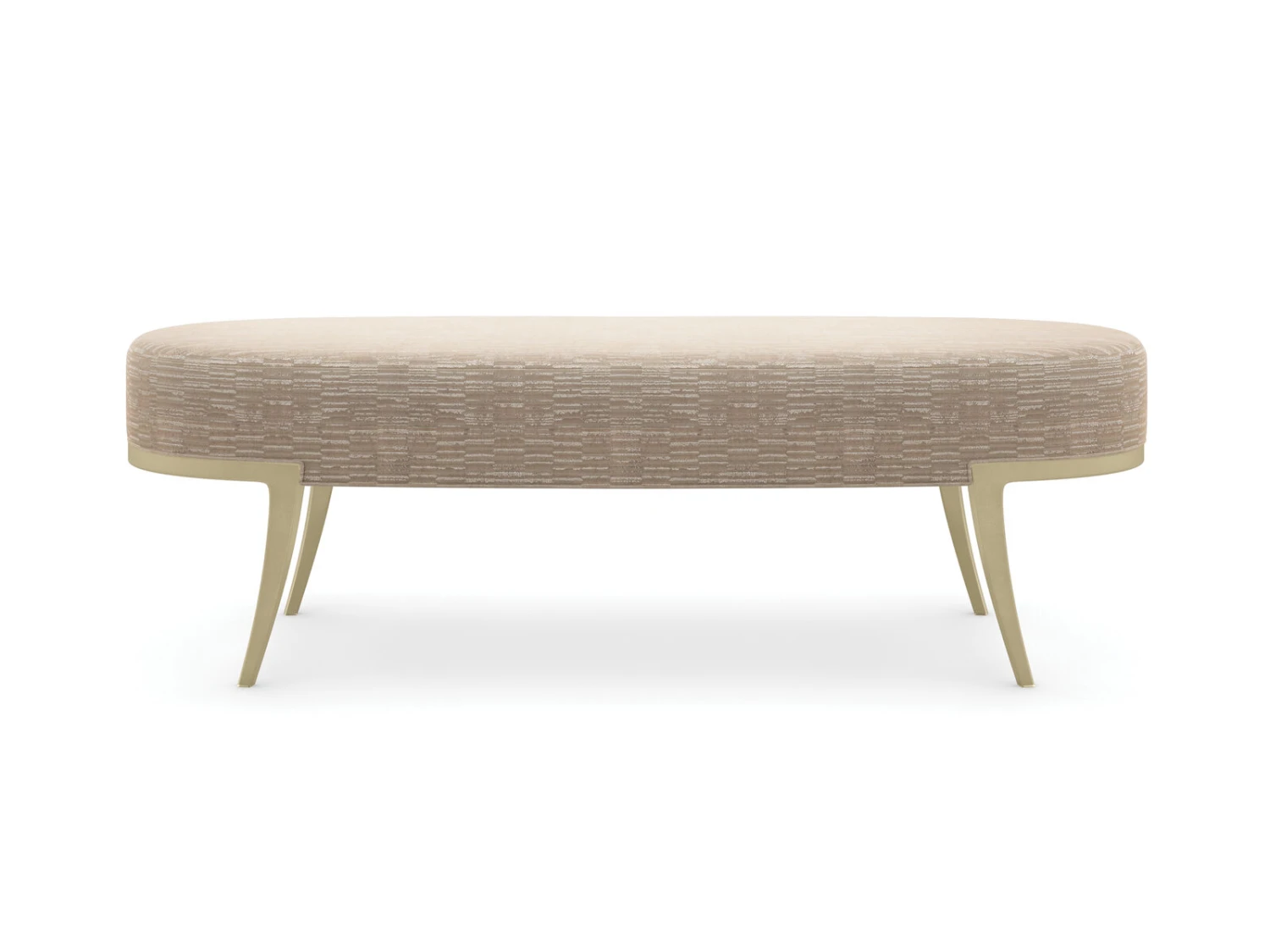 An alluring accent with tactile appeal, this bedroom bench makes a striking impression in a metallic, Belgian cut velvet. Its classic oval shape is beautifully balanced by curved metal legs in a Whisper of Gold. Makes a perfect complement to the end of the bed, or a glamorous addition to hallway nooks and living rooms.