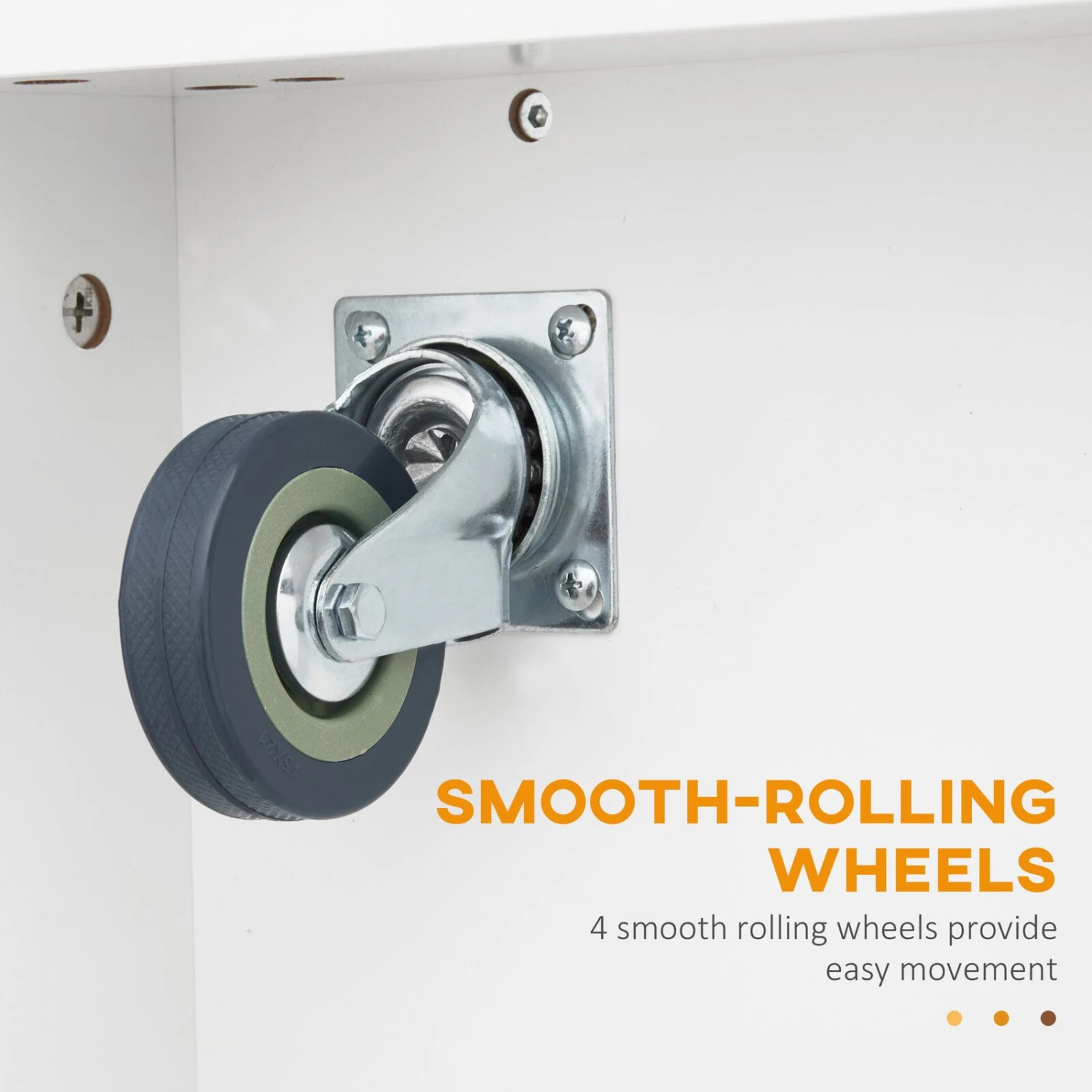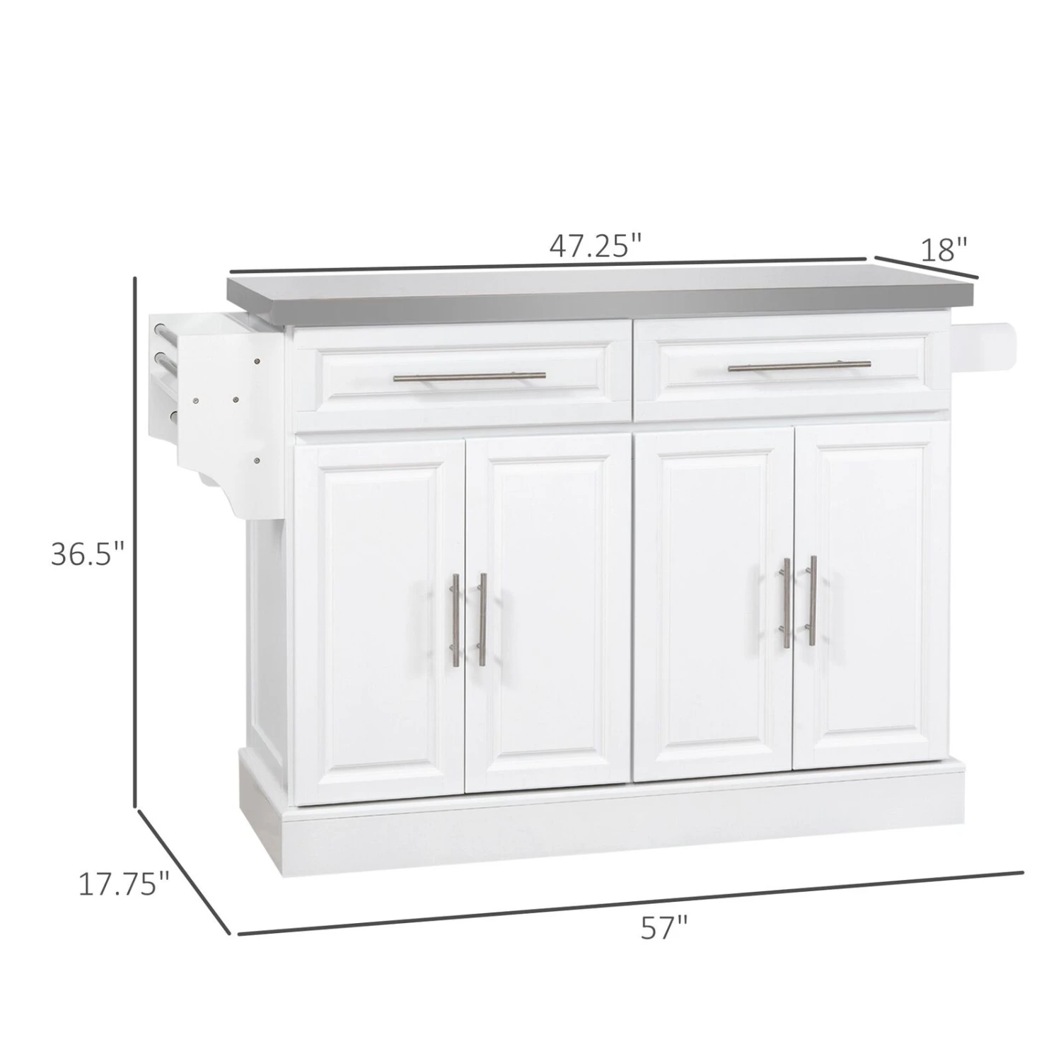 White Rolling Kitchen Island with Storage, Portable Kitchen Cart with Stainless Steel Top, 2 Drawers, Spice, Knife and Towel Rack