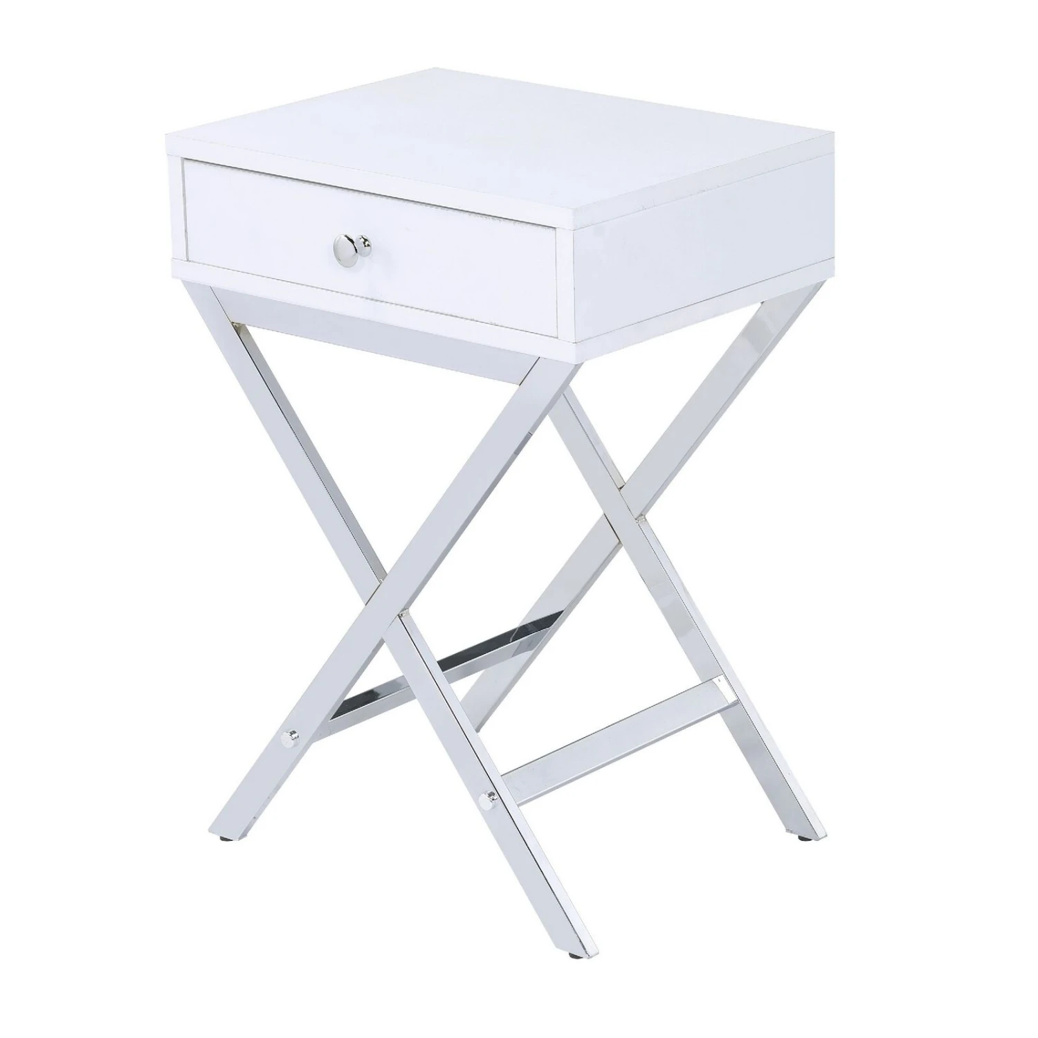 Amalgamate your home interior with the addition of this contemporary style side table, featuring 1 drawer storage space facilitated with round pull handle for easy use. Constructed sturdily from metal, wood and veneer, it is accented in the hues of white and silver. Supported on crossed legs, its top can be used to showcase your decor items. It will not only serve the best of its purpose but will also embellish your existing decor.