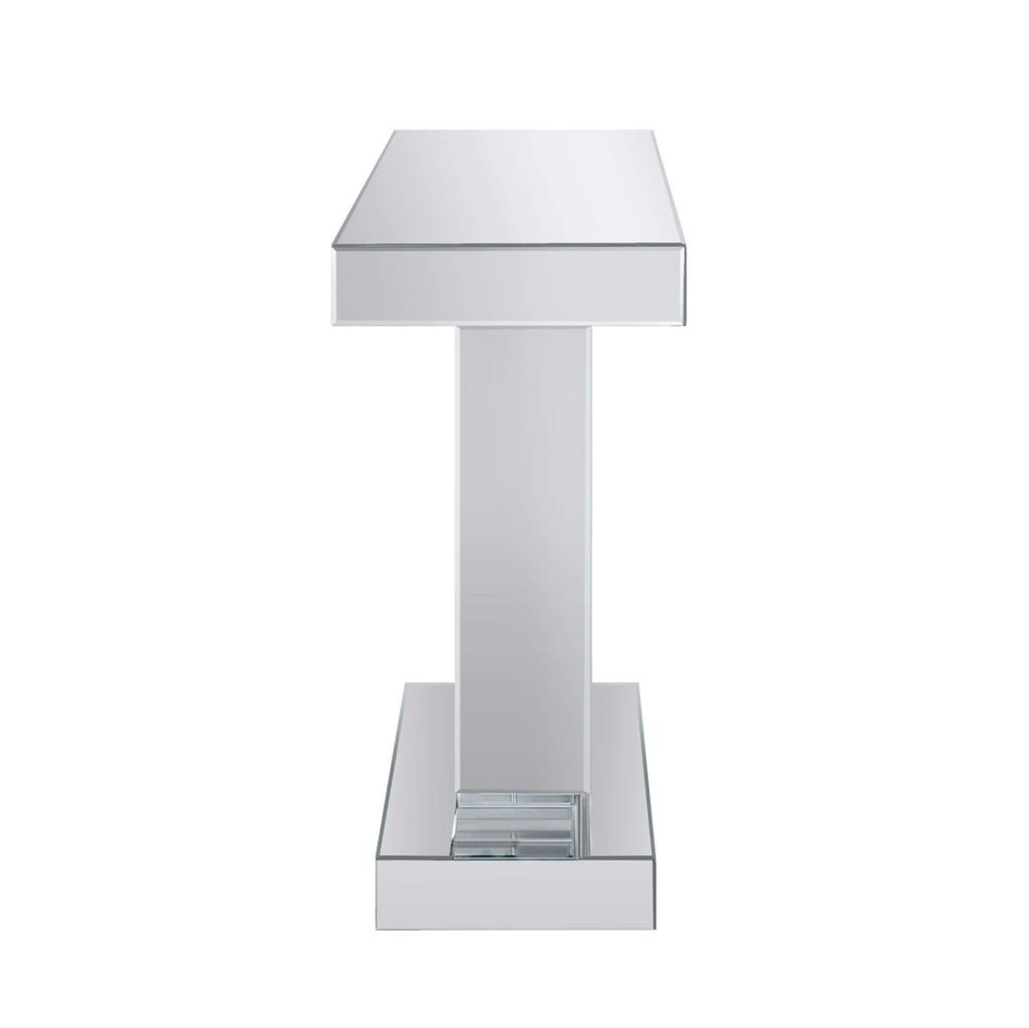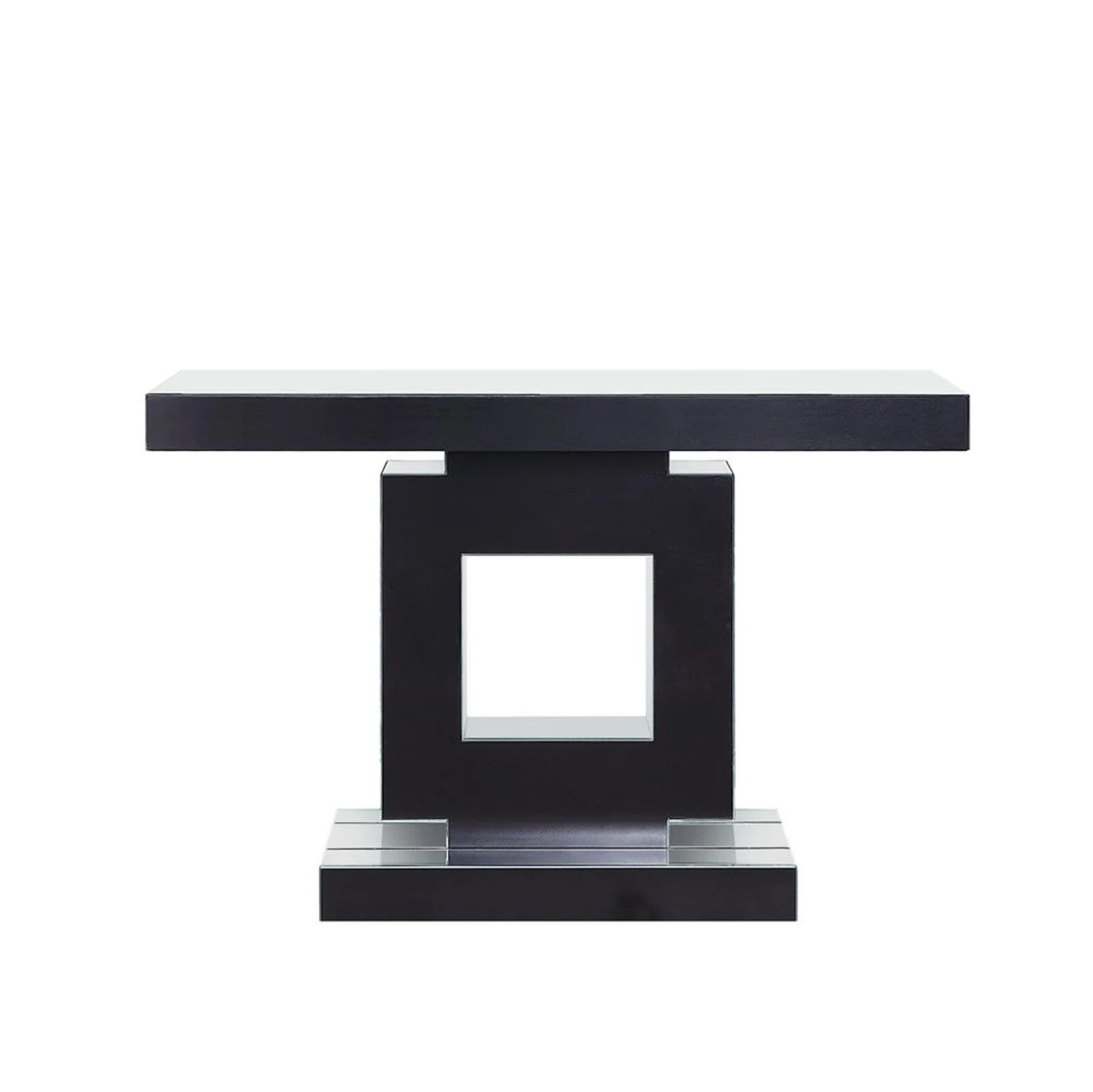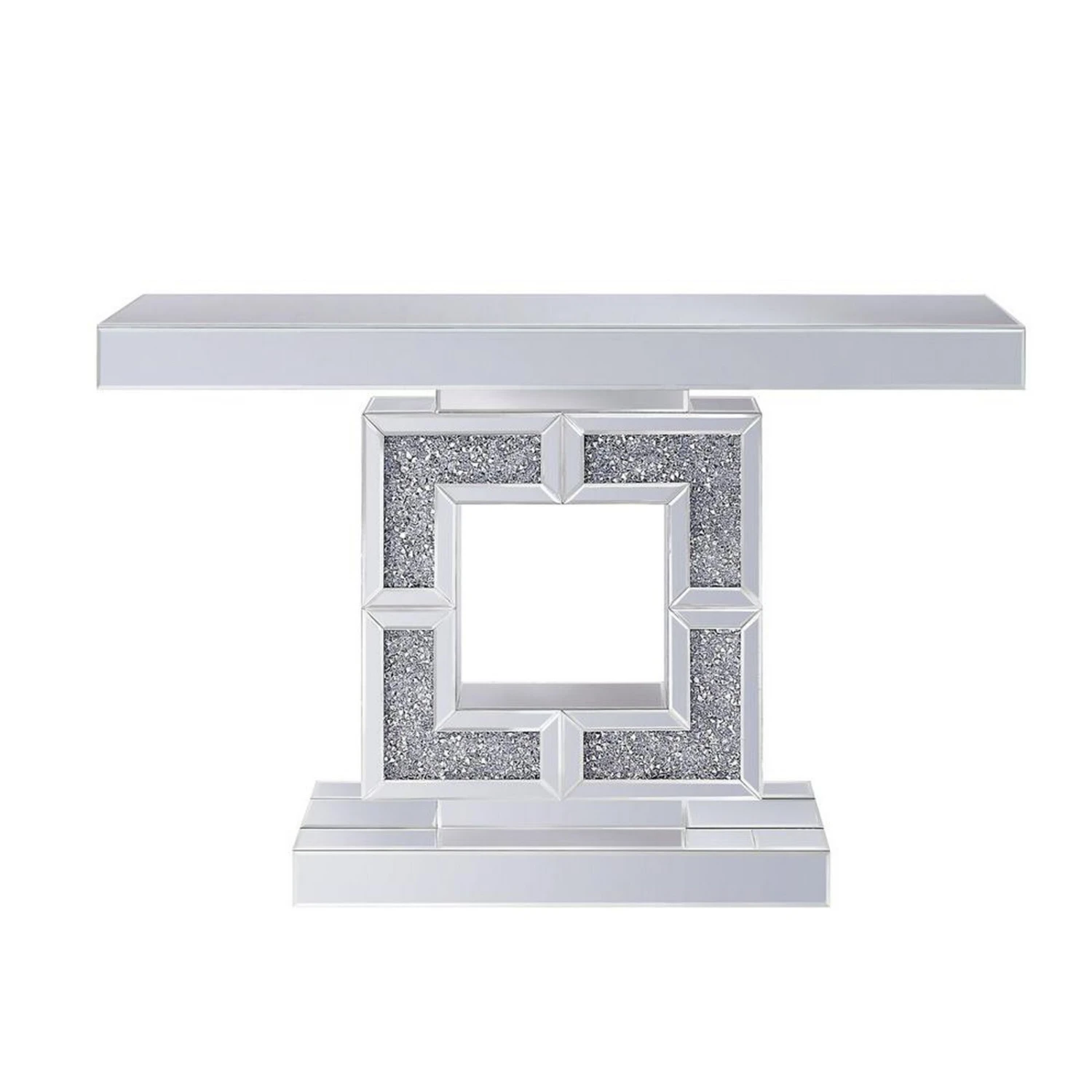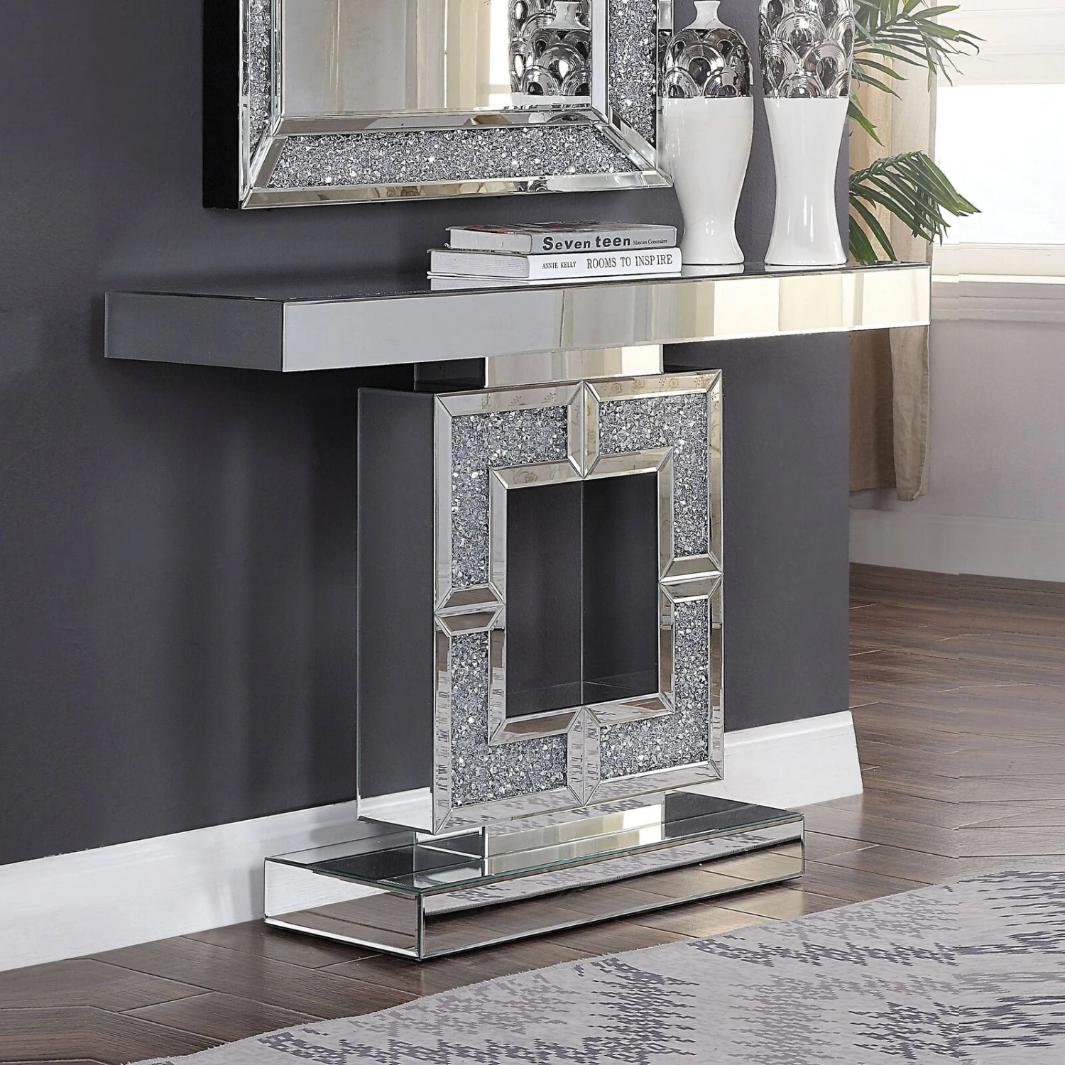 Blending modern design with a hint of glam appeal, this Console Table lends a contemporary appeal to any living room ensemble. The frame of this table is constructed from durable Composite Wood materials and it is covered with beveled mirrors that brightly reflects the available light to make your home feel crisp and clean. The table is supported by an open square keyhole pedestal which is inset with faux crystals inlay for a glittery highlight. Add this Console table behind your sofa to bounce light around your room or place it in your entryway right by the front door so you can handily drop your keys at the end of a long day. Note: Other featured items in image except this Console table are sold separately.