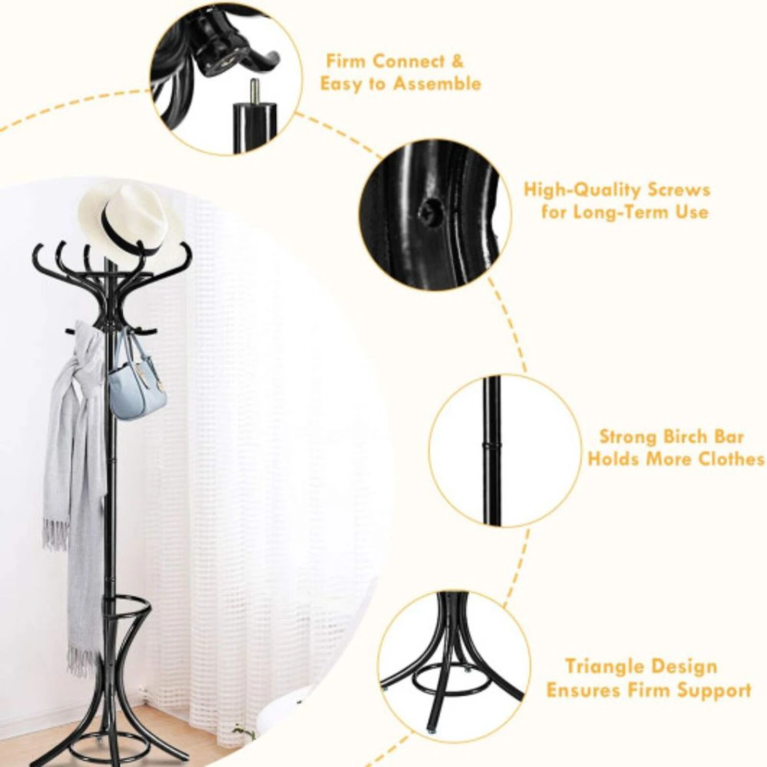 ● Stable Four Points Base: The coat rack with four-point support base ensures high stability, which can hold up to 22lbs. Thus, you can store different items without worries. In addition, 4 anti-slip foot pads ensure extra sturdiness and protect the floor from scratching.
