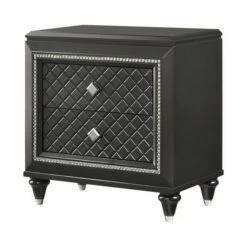 Bring home this beautiful two drawer nightstand which adds to the aesthetics of your home along with solving the need of storage. This nightstand has intricate carved details and is featured with faux crystal inlays. Incorporated with metal knobs and featuring turned legs supports with metal head caps.